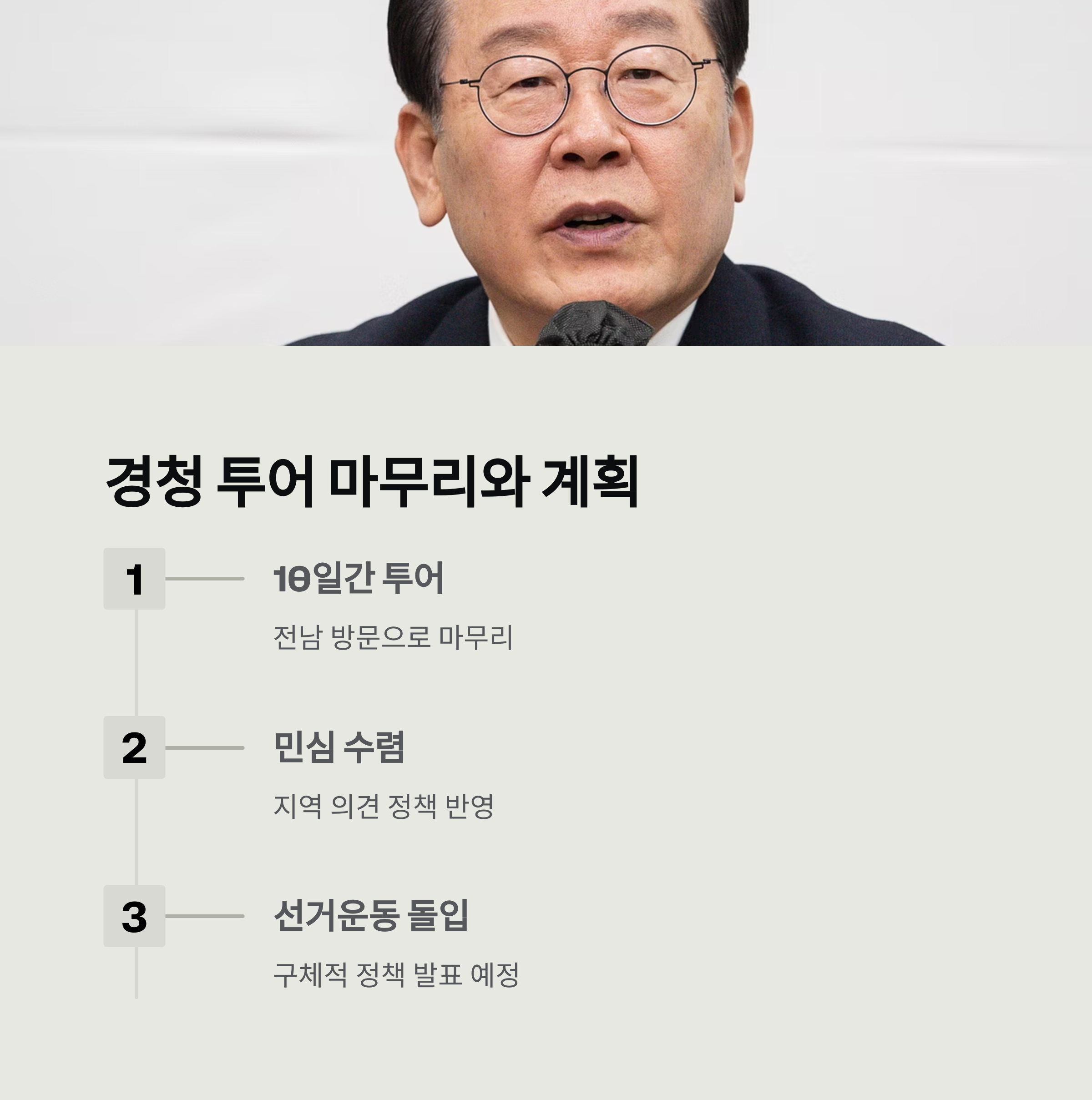 전남 방문을 끝으로 10일간의 경청 투어를 마무리한 이재명 후보는, 공식 선거운동에 돌입할 계획입니다. 경청 투어를 통해 수렴한 민심을 바탕으로, 정책을 구체화하고 유권자와의 소통을 강화할 예정입니다.