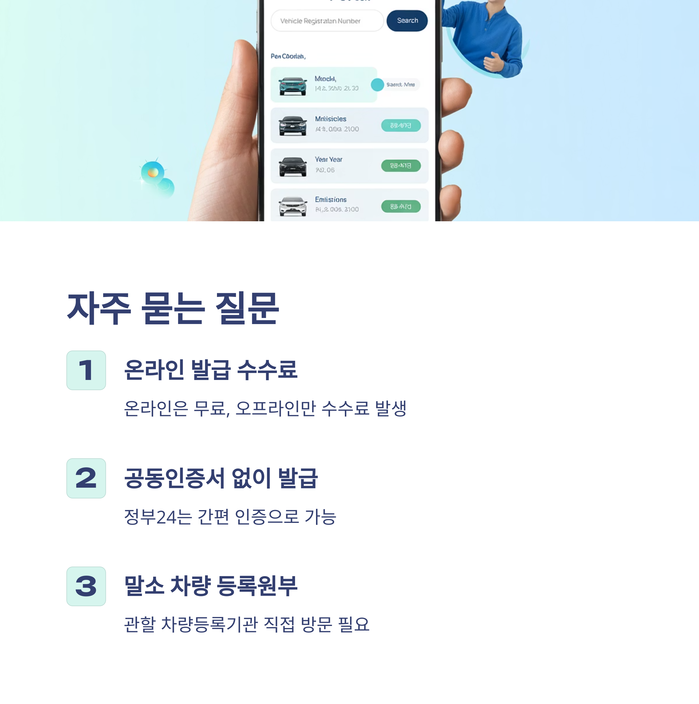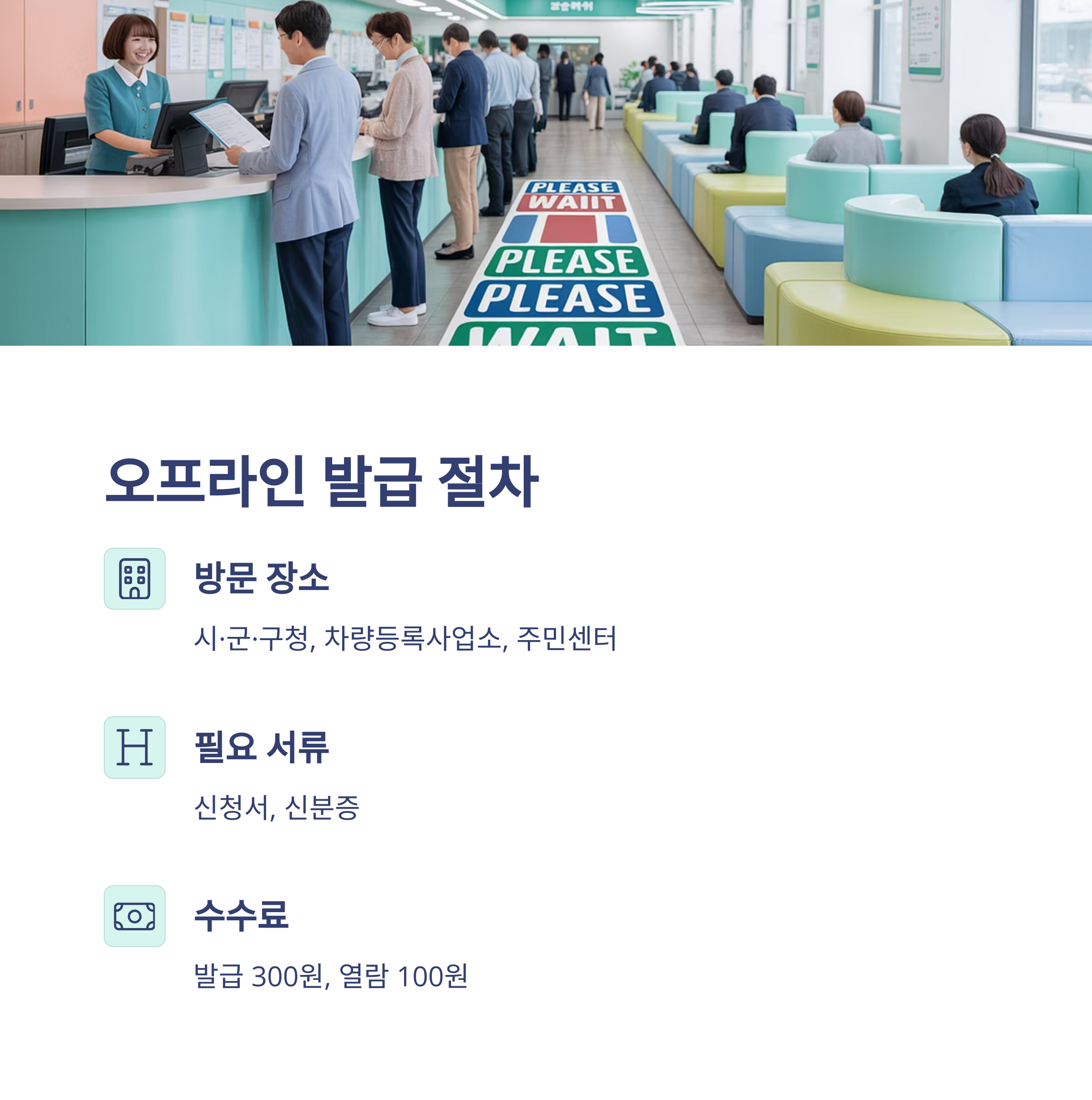 오프라인으로는 가까운 시·군·구청, 차량등록사업소, 주민센터 등을 방문하여 발급받을 수 있습니다.