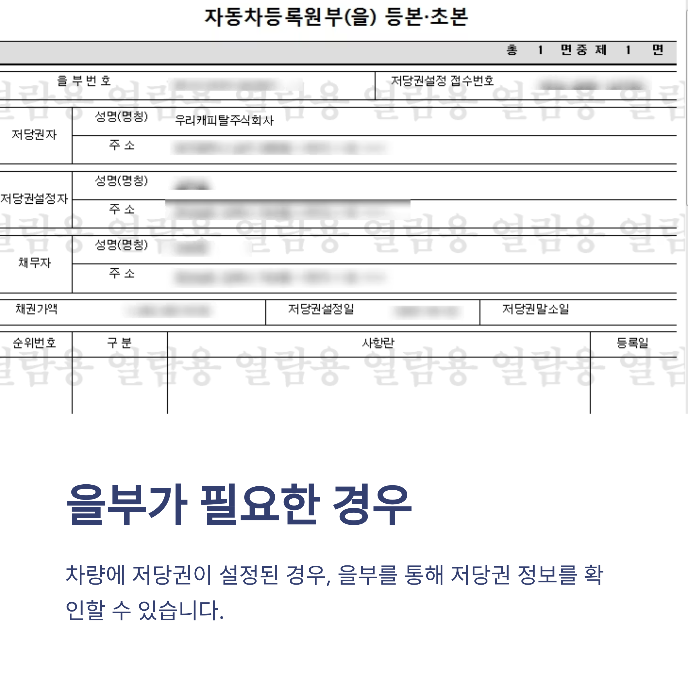 차량에 저당권이 설정된 경우, 을부를 통해 저당권 정보를 확인할 수 있습니다.