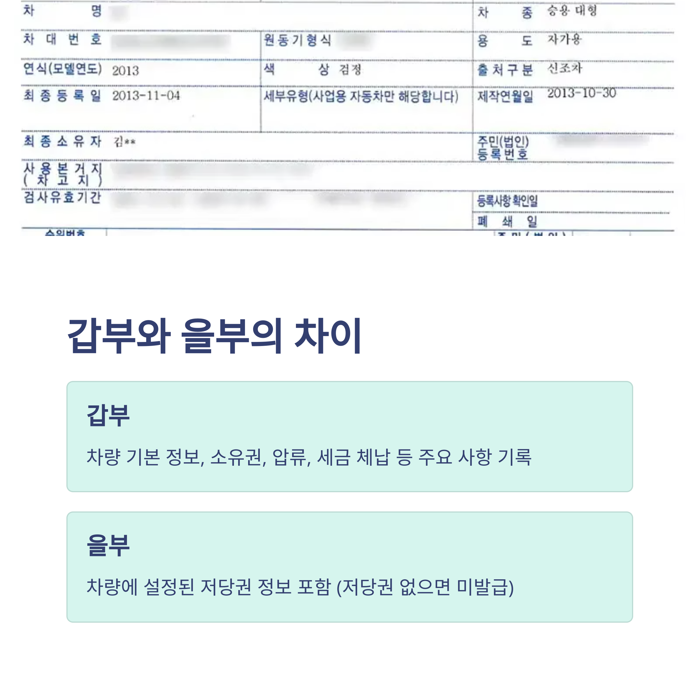 - 갑부: 차량의 기본 정보와 소유권, 압류, 세금 체납 등 주요 사항이 기록됩니다.