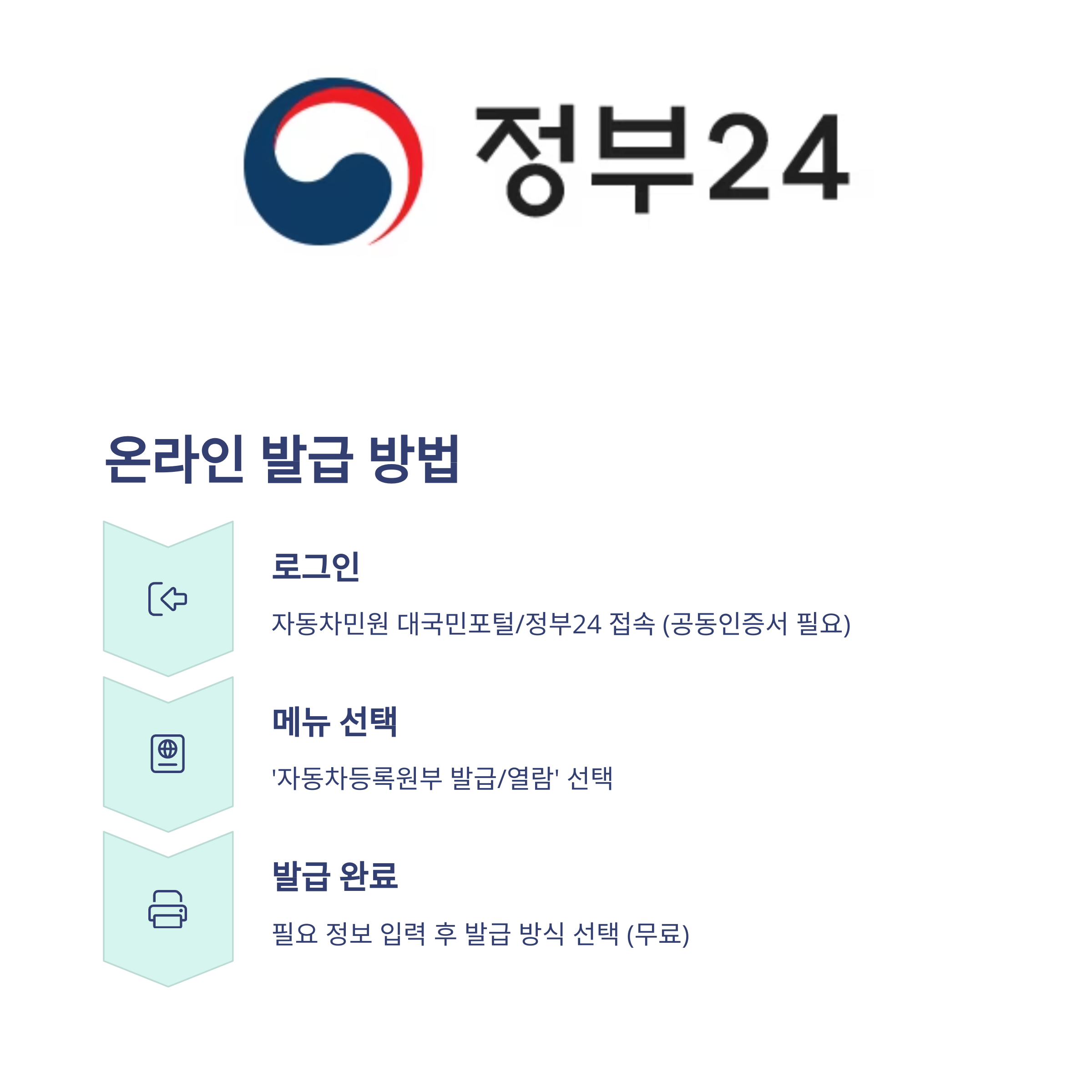 온라인으로는 자동차민원 대국민포털 또는 정부24를 통해 발급받을 수 있습니다.