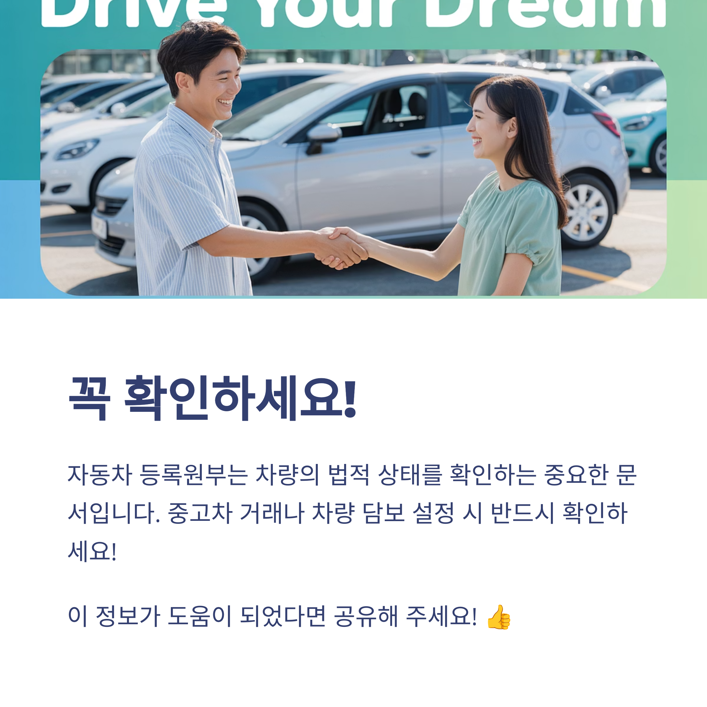자동차 등록원부는 차량의 법적 상태를 확인하는 중요한 문서입니다. 중고차 거래나 차량 담보 설정 시 반드시 확인하시기 바랍니다.