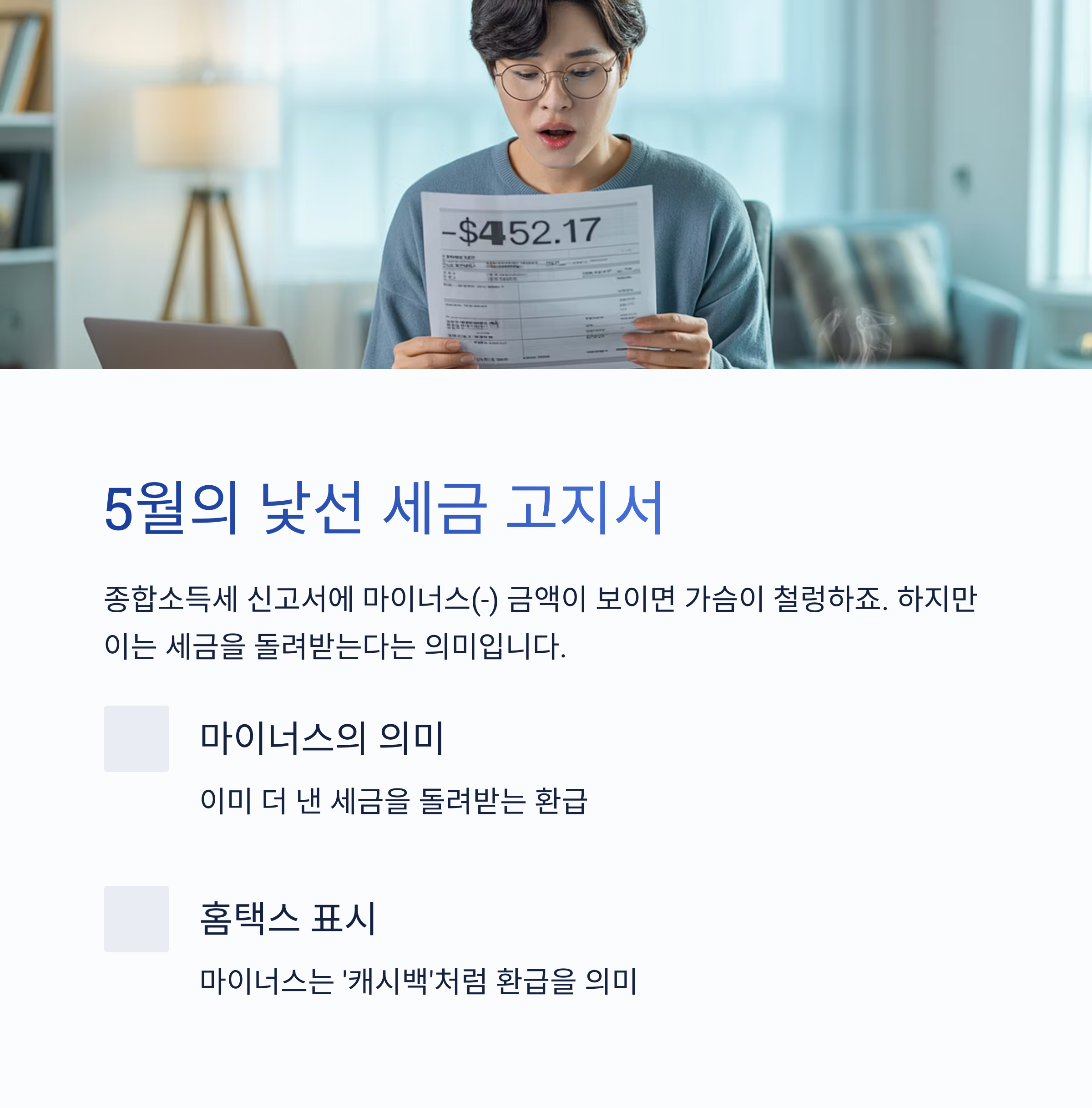 5월이 되면 많은 자영업자와 프리랜서들의 우편함엔 ‘국세청’에서 온 종합소득세 신고서가 도착합니다. 특히 처음 신고서를 받아본 분들은 숫자 하나하나가 낯설기 마련인데요, 그 중에서도 ‘마이너스(-)’ 기호가 찍힌 금액을 보면 가슴이 철렁하죠.