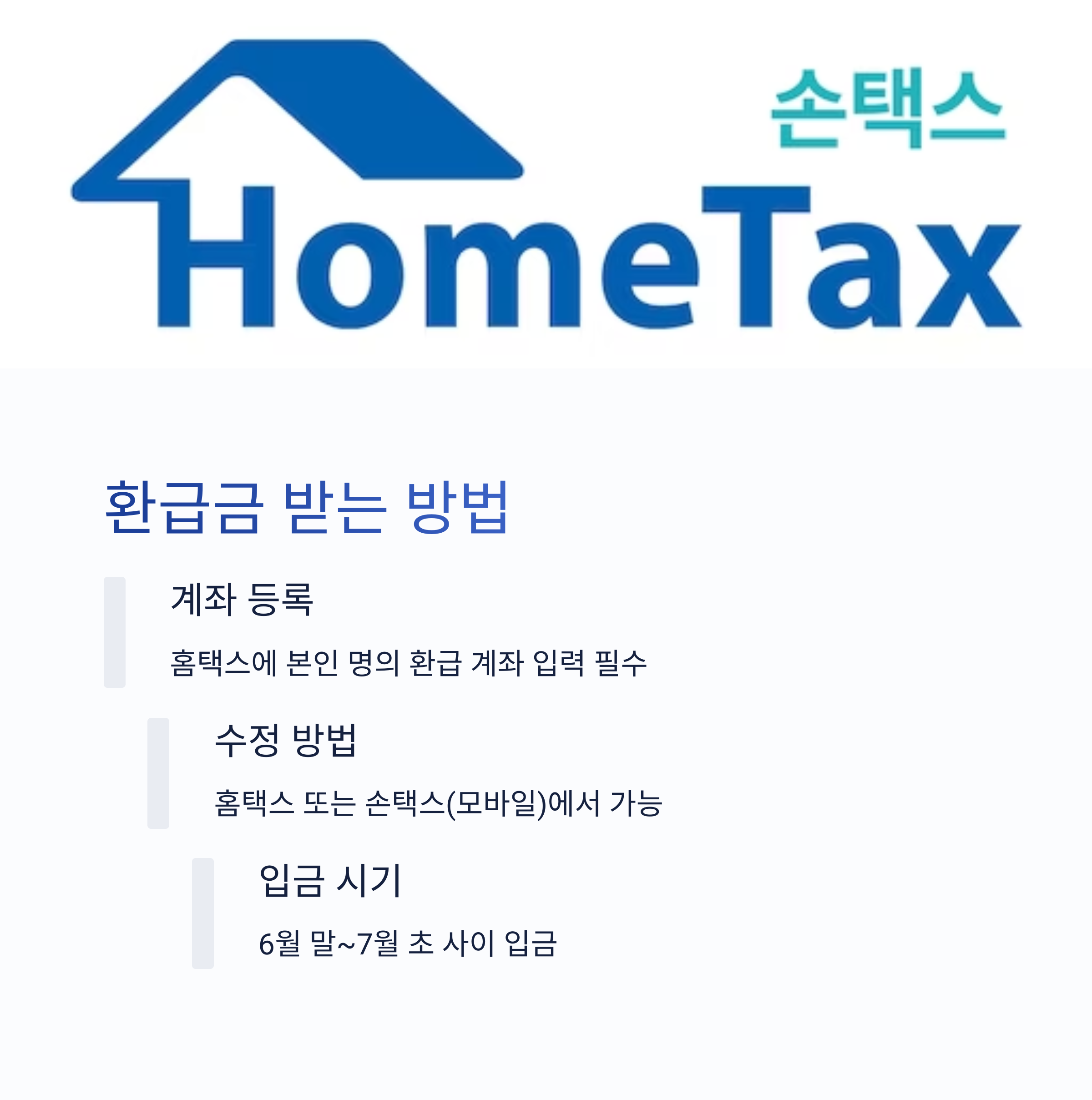 마이너스라고 해서 자동으로 돈이 들어오는 건 아닙니다. 반드시 홈택스에 본인 명의의 환급 계좌를 입력해야 합니다. 만약 입력하지 않았거나 실수했다면 홈택스 또는 손택스(모바일)에서 수정이 가능합니다. 환급금은 대개 6월 말~7월 초 사이에 입금되며, 지방소득세 환급은 그보다 약간 늦게 들어옵니다.