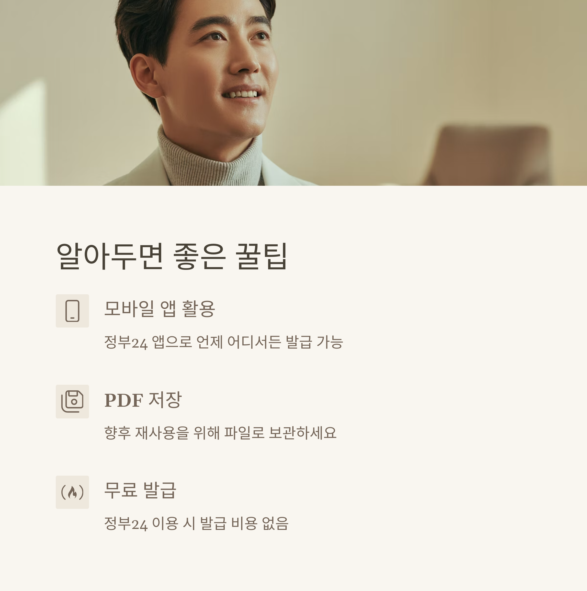 온라인 발급의 가장 큰 장점은 언제 어디서든 가능하다는 것! 모바일 정부24 앱도 활용해보세요. 인증 수단만 있으면 서류 하나쯤은 바로 발급 가능하니 굳이 줄 서서 기다릴 필요가 없습니다 😊