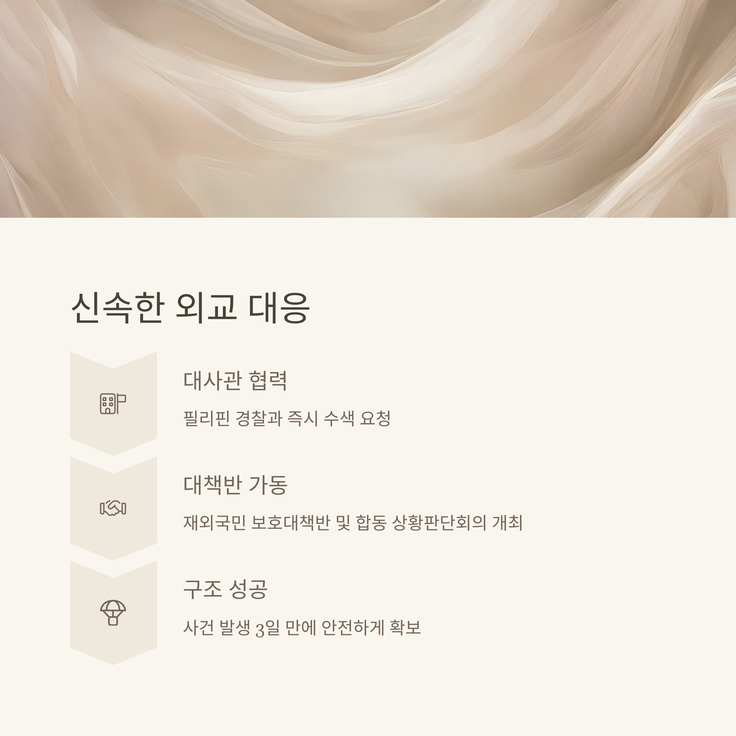피해자의 가족으로부터 납치 사실을 접수한 주필리핀대사관은 즉시 필리핀 경찰과 협력해 수색을 요청했습니다. 동시에 외교부 본부는 재외국민 보호대책반을 가동하고, 윤주석 영사안전국장이 주재하는 합동 상황판단회의를 개최해 지원체계를 정비했습니다. 이 같은 총력 대응 덕분에 A씨는 사건 발생 3일 만인 5일 오전, 필리핀 경찰에 의해 안전하게 확보되었습니다.