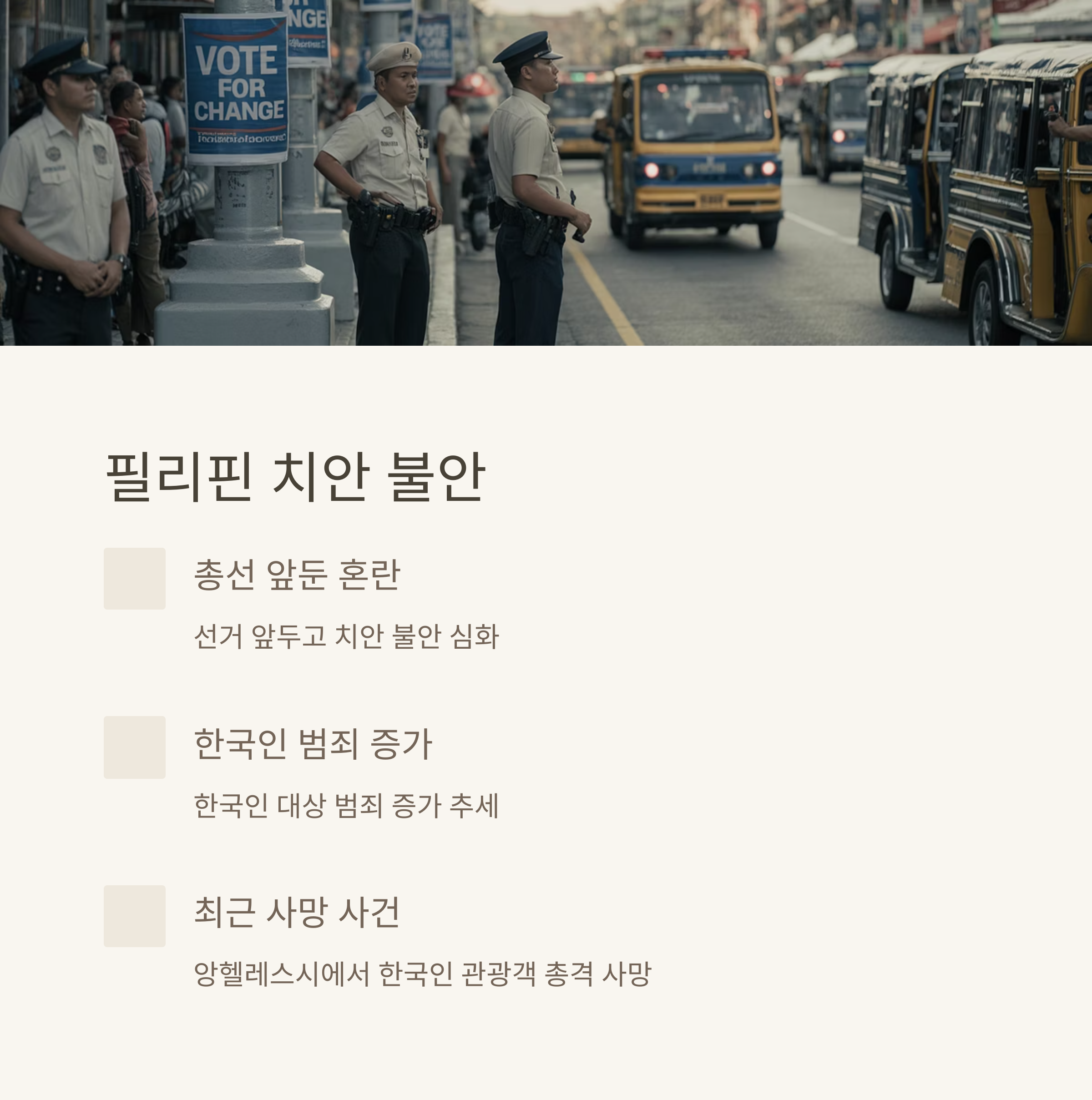 최근 필리핀은 총선을 앞두고 치안 불안이 심화되고 있습니다. 특히 한국인을 대상으로 한 범죄도 증가하고 있는 추세입니다. 지난달엔 앙헬레스시 한인타운에서 오토바이를 탄 강도에게 총을 맞고 숨진 한국인 관광객 사건도 발생했습니다.