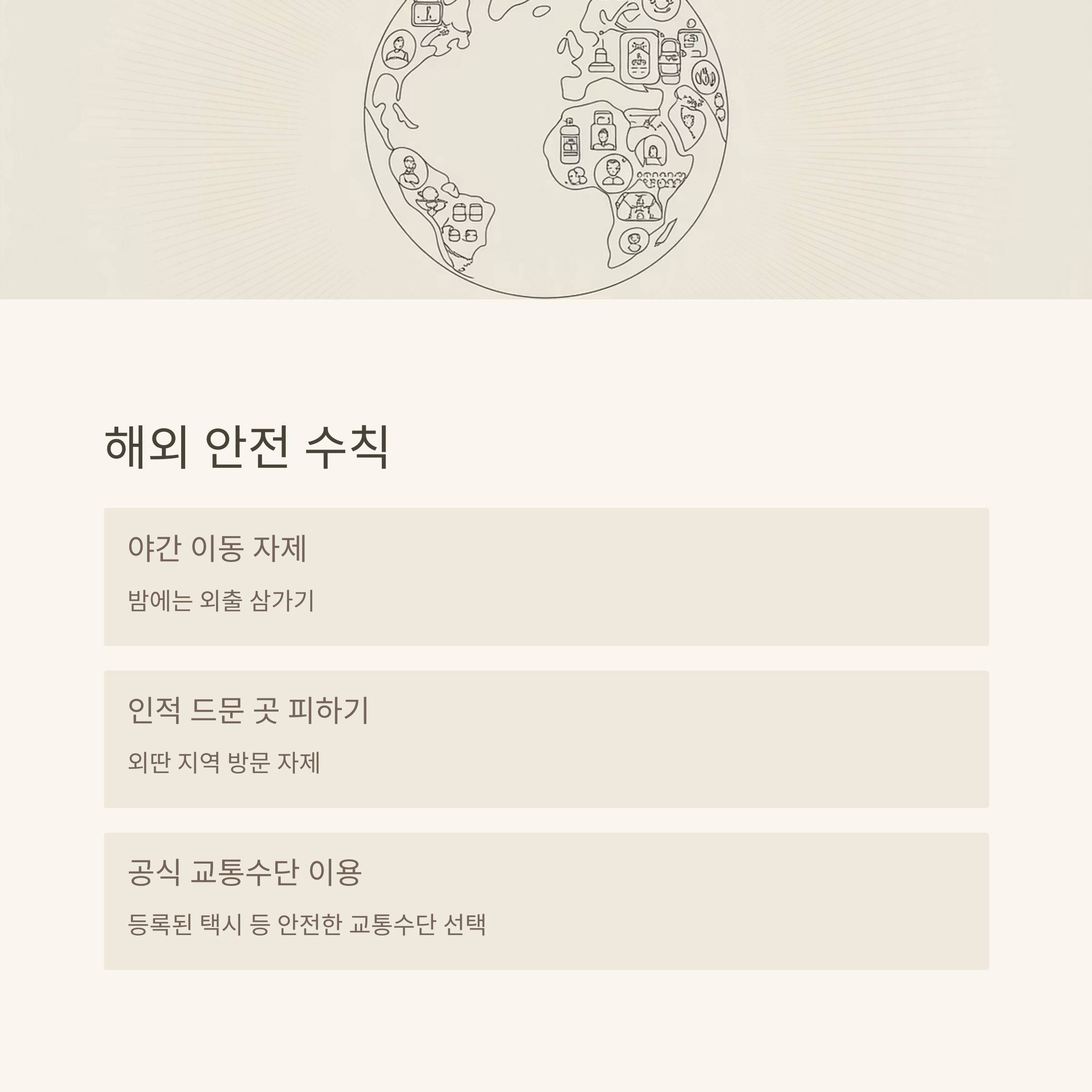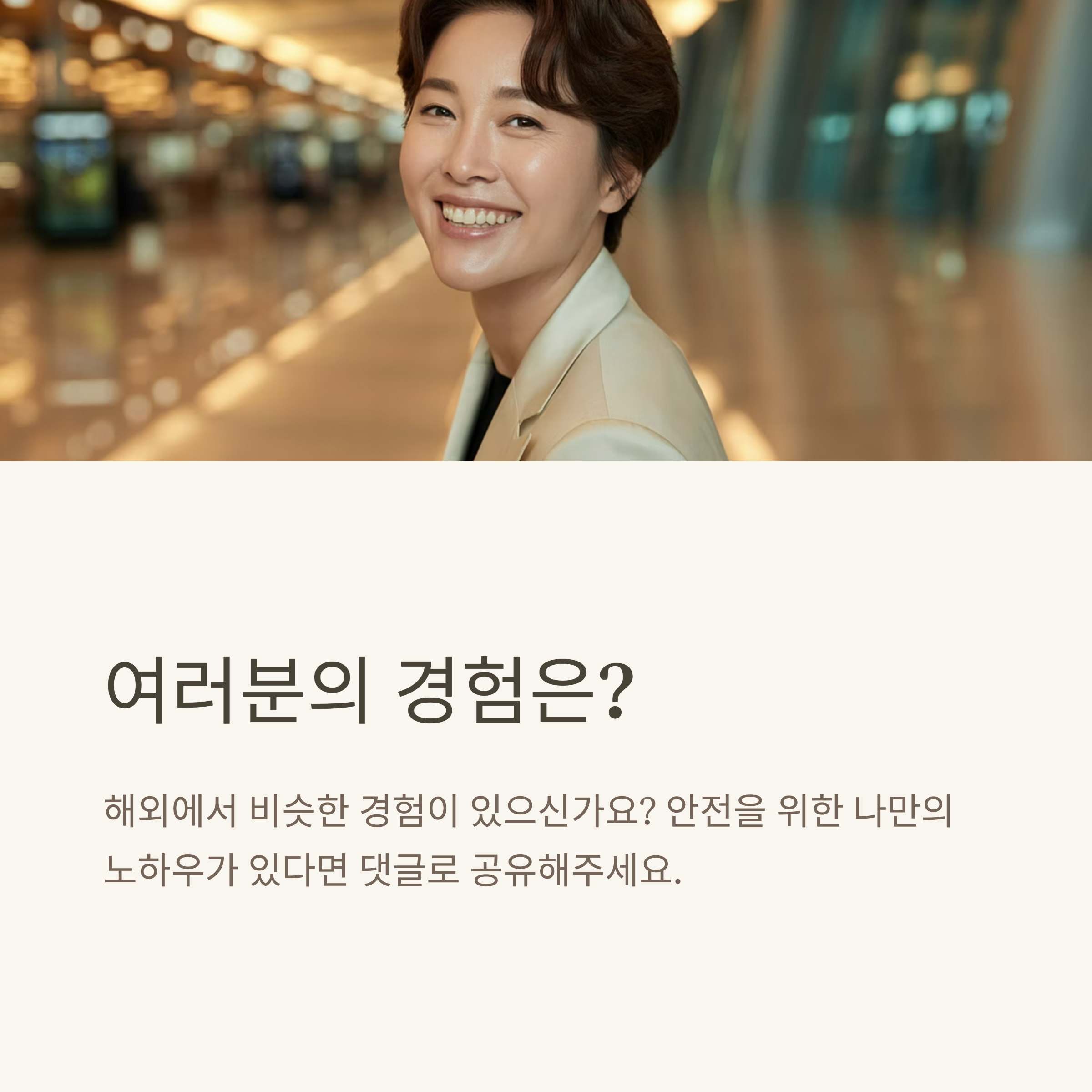 혹시 해외에서 비슷한 경험을 하신 적이 있으신가요? 안전을 위해 실천 중인 나만의 노하우가 있다면 댓글로 공유해주세요. 여행 중 도움이 되는 이야기를 함께 나눠요!