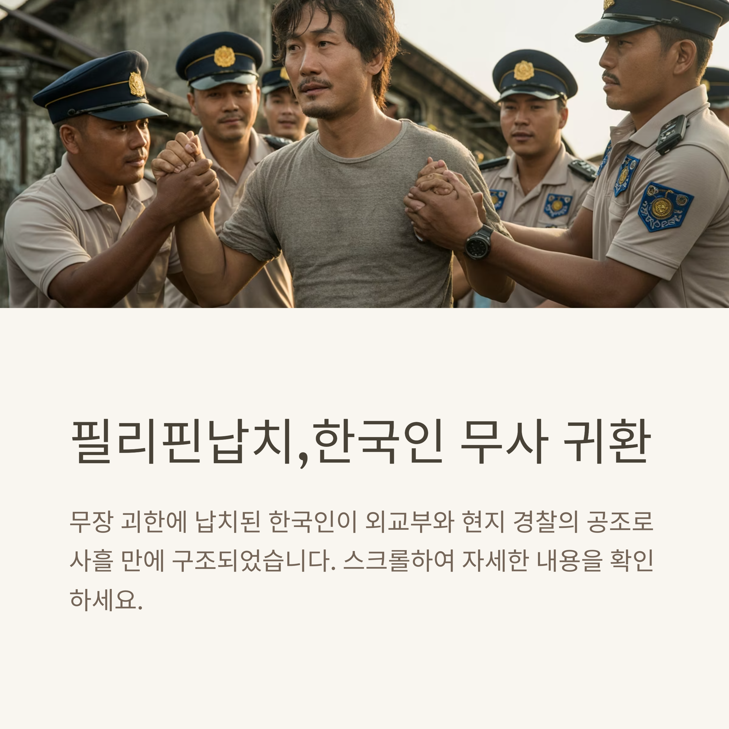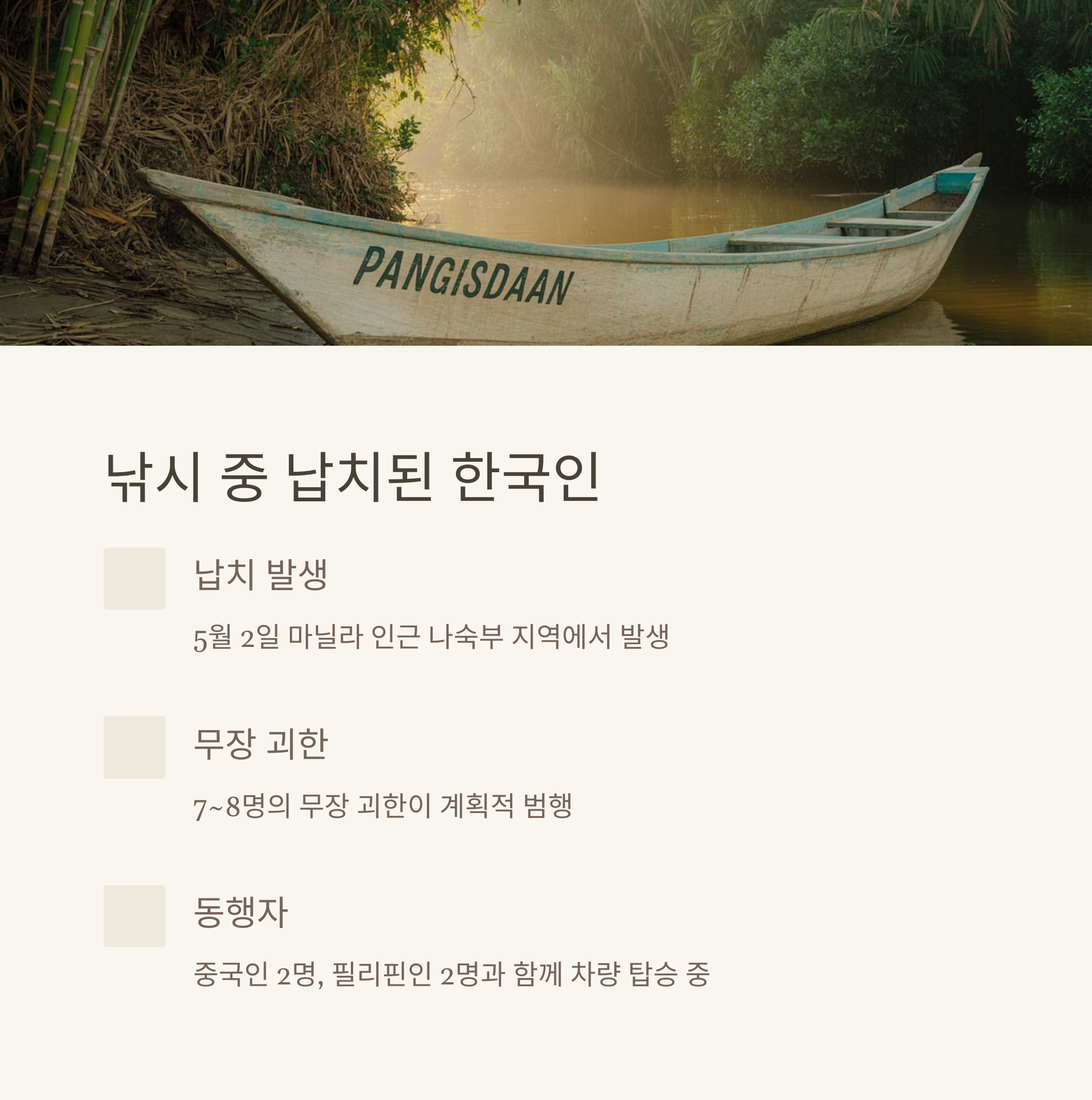 지난 5월 2일(현지시간), 한국인 A씨는 필리핀 마닐라에서 약 90㎞ 떨어진 나숙부 지역으로 낚시를 가던 중 무장 괴한 7~8명에게 납치되었습니다. 당시 A씨는 중국인 2명, 필리핀인 2명과 함께 차량에 동승 중이었고, 괴한들은 이들을 대상으로 계획적인 범행을 저지른 것으로 알려졌습니다.