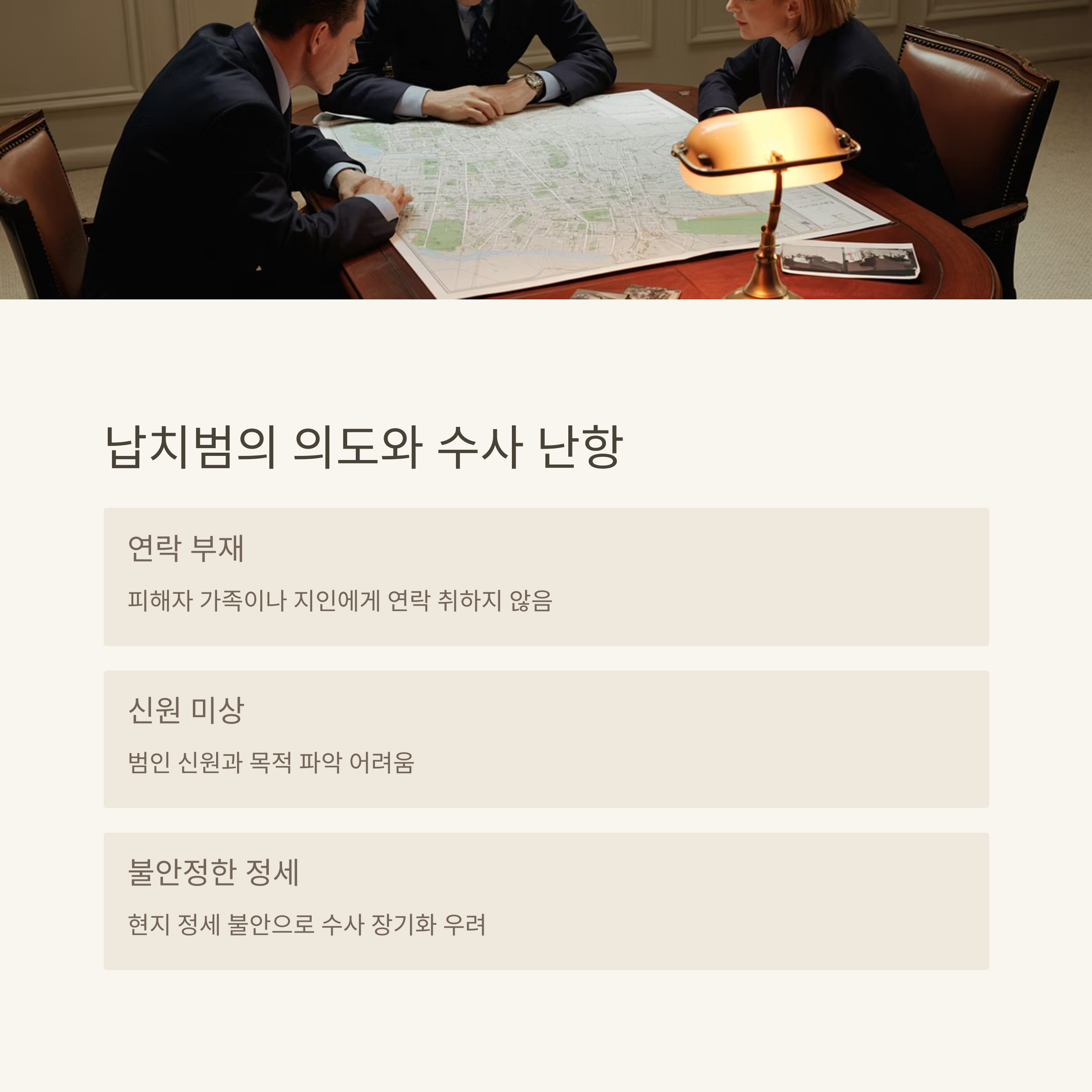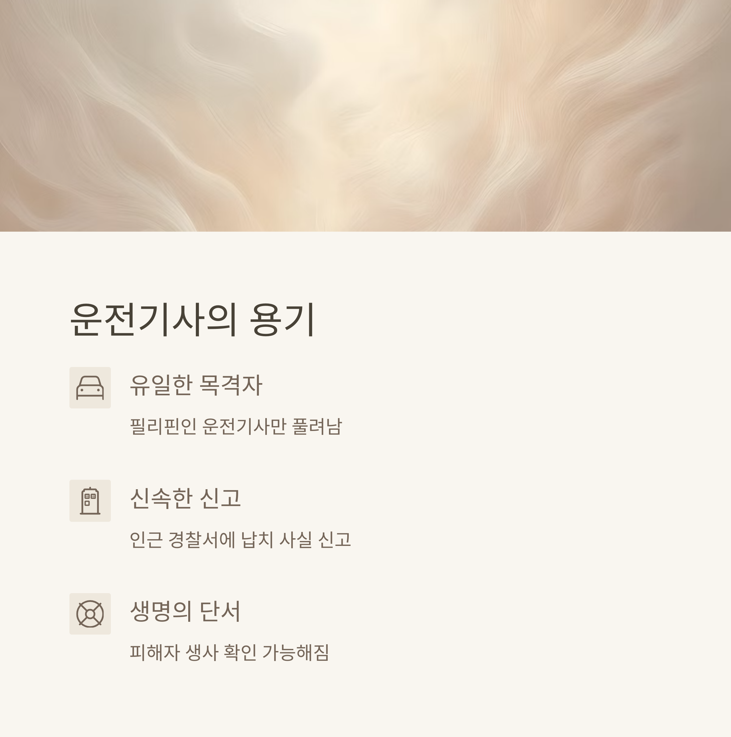 사건의 전말이 알려진 건 필리핀인 운전기사 B씨 덕분이었습니다. 괴한들은 B씨만 도로변에 풀어줬고, 그는 인근 경찰서로 이동해 납치 사실을 신고했습니다. 그의 용기 있는 행동으로 수사가 시작될 수 있었고, A씨의 생사도 확인할 수 있었습니다.