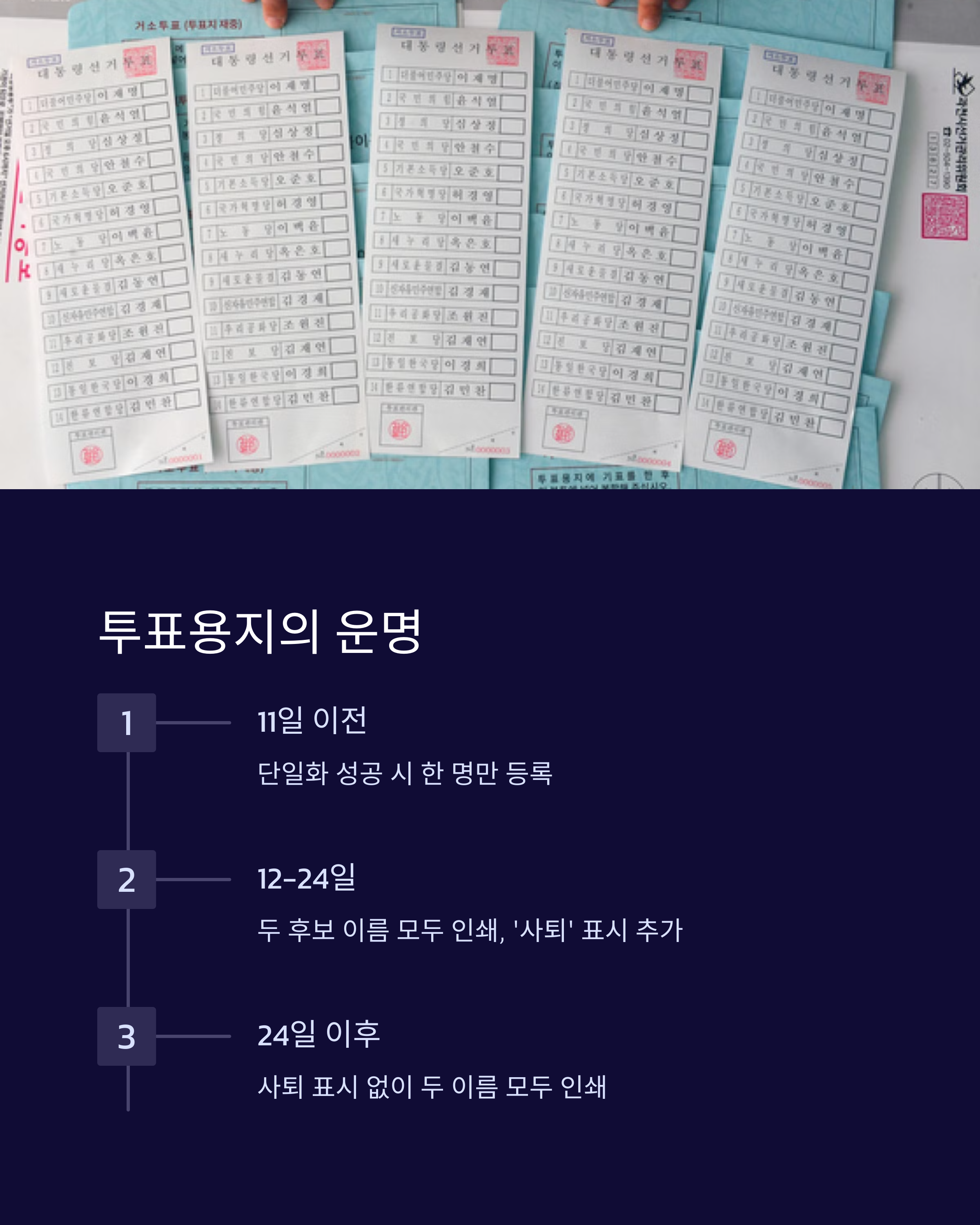 만약 단일화가 12일부터 24일 사이에 이뤄지면, 투표용지에는 두 후보 이름 모두 인쇄되며 ‘사퇴’ 표시만 추가됩니다. 심지어 이 시기도 놓치면 사퇴 표시조차 없이 두 사람 이름이 나란히 적히는 초유의 사태가 발생할 수 있습니다.