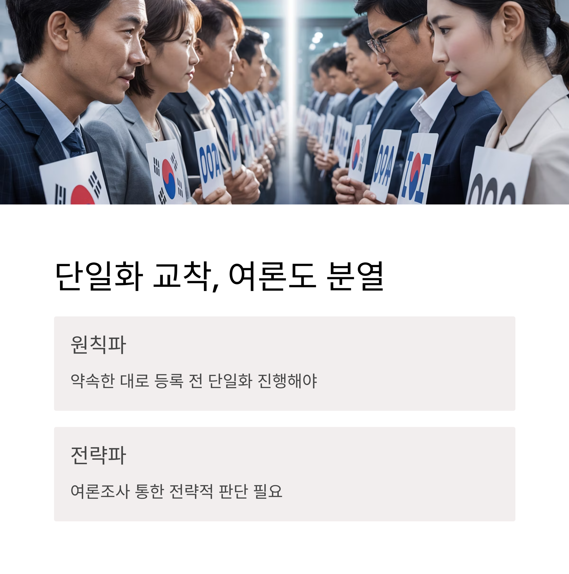 두 후보 간의 팽팽한 입장 차로 인해 단일화 논의는 교착 상태에 빠졌으며, 지지층 내에서도 “원칙 지켜야 vs 전략적 판단이 필요하다”는 의견이 엇갈리고 있습니다.