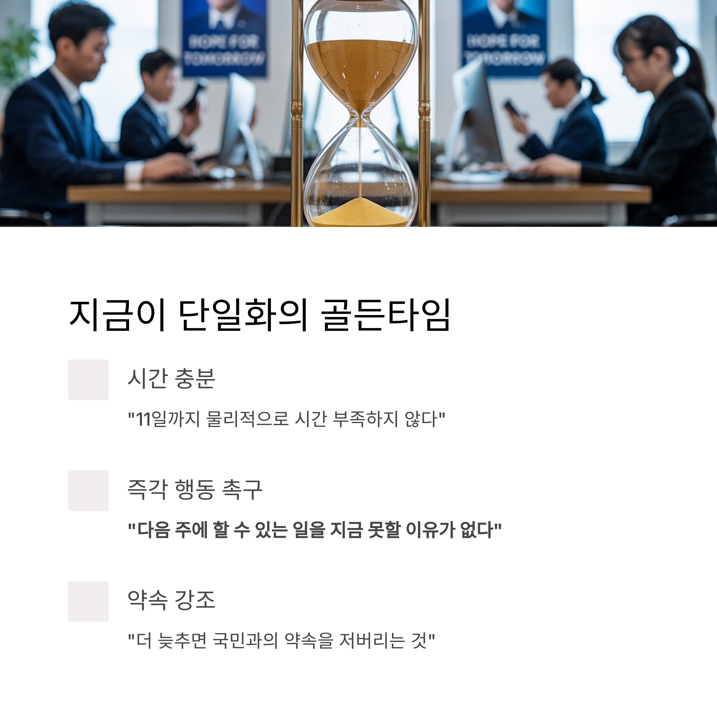 한 후보 캠프는 김 후보 측의 제안에 대해 “11일까지는 물리적으로 시간이 부족하지 않다. 지금도 충분히 가능하다”며 “다음 주에 할 수 있는 일을 지금 못할 이유가 없다”고 강하게 주장했습니다.