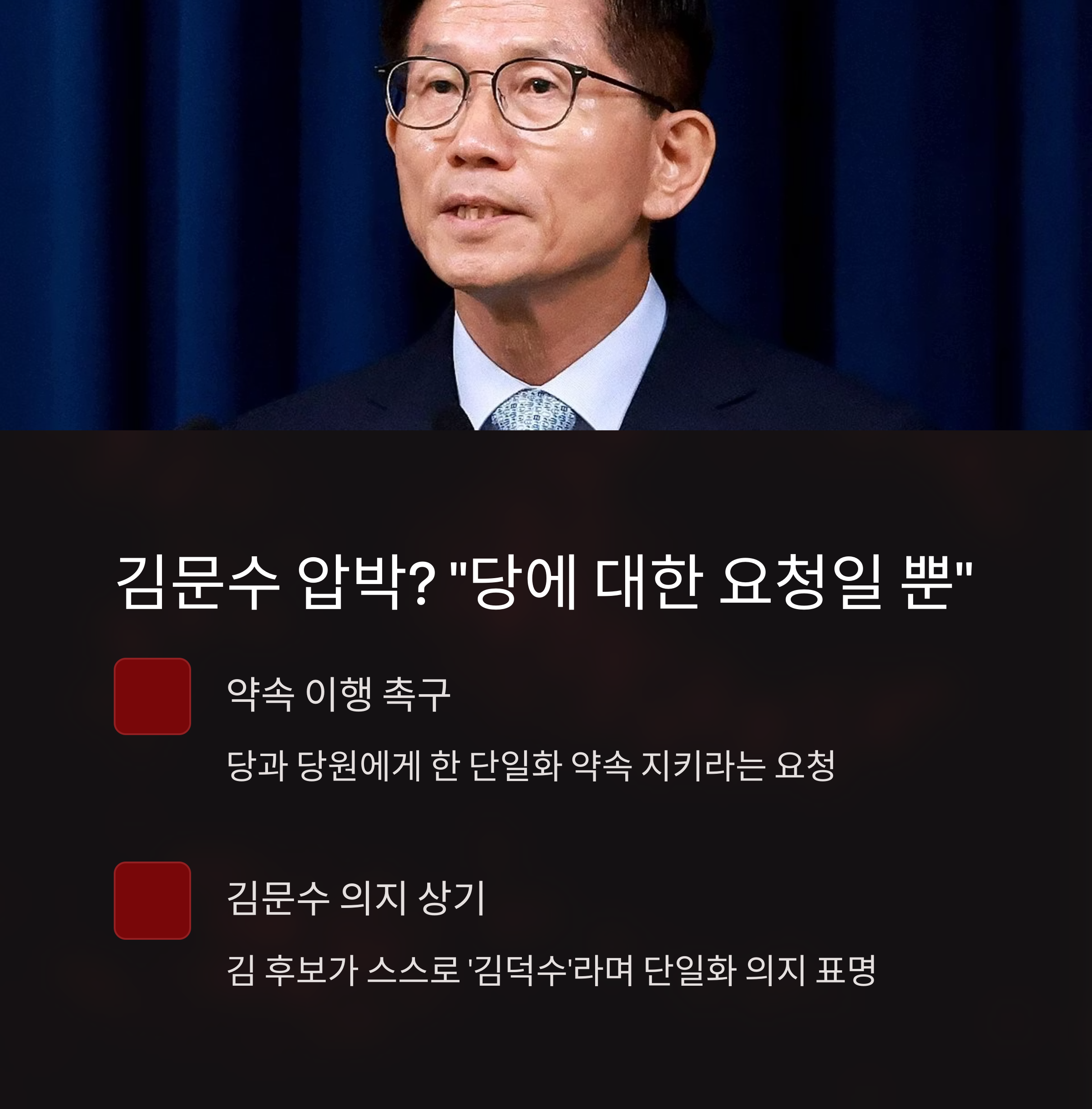 한 후보는 김문수 후보를 압박하기 위한 발표가 아니라며 “당과 당원에게 한 단일화 약속을 지키라는 촉구”라고 강조했습니다. 그는 “김 후보가 스스로 ‘김덕수’라는 표현까지 쓰며 단일화 의지를 밝혔던 점을 상기시켰습니다.”