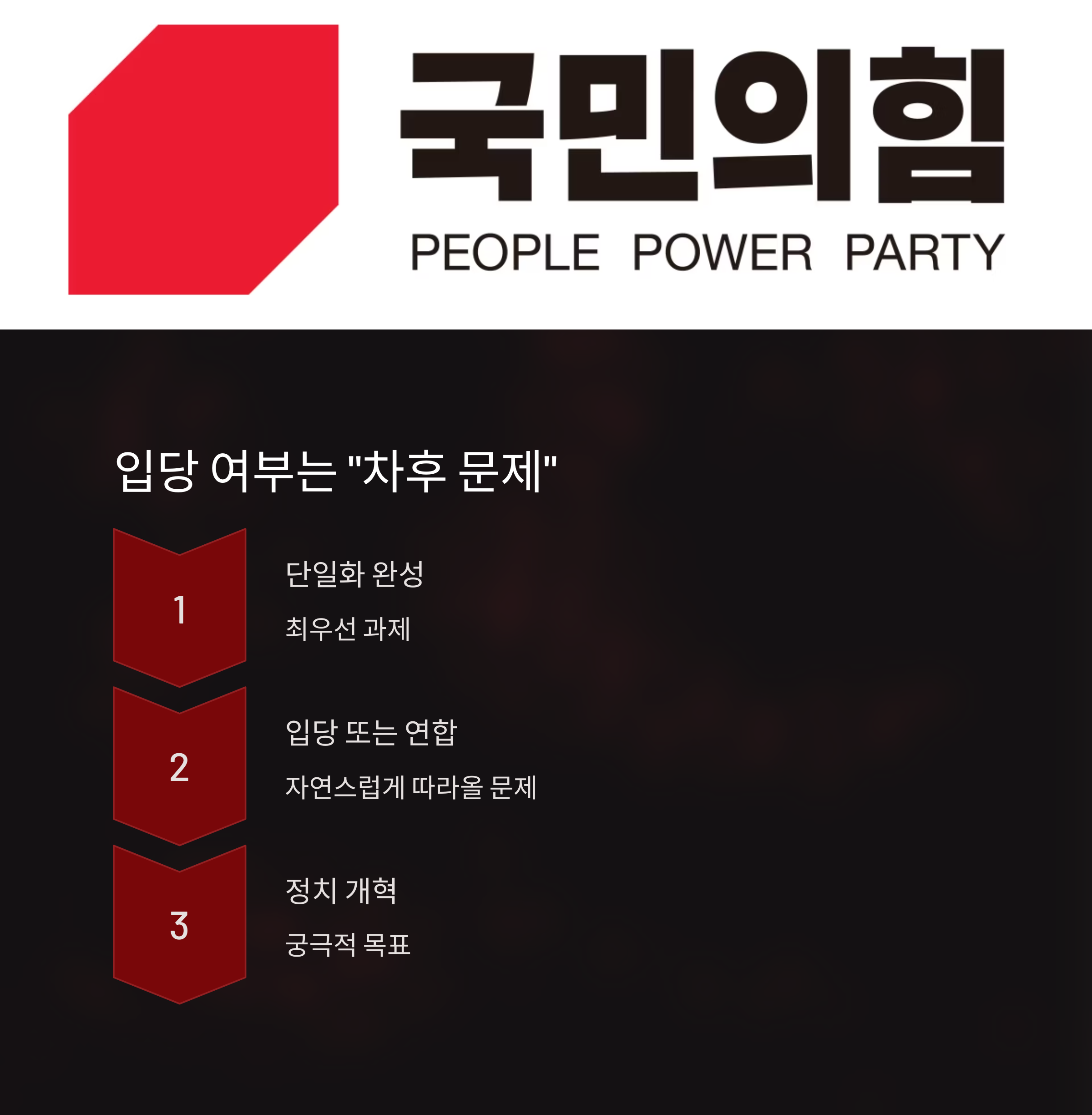국민의힘 입당 여부에 대해선 구체적 답변을 피했지만, “단일화를 완성하면 입당이든 연합이든 자연스럽게 따라올 것”이라며 현실적 접근을 보였습니다. 다만, “지금은 단일화가 최우선 과제”라고 거듭 강조했습니다.