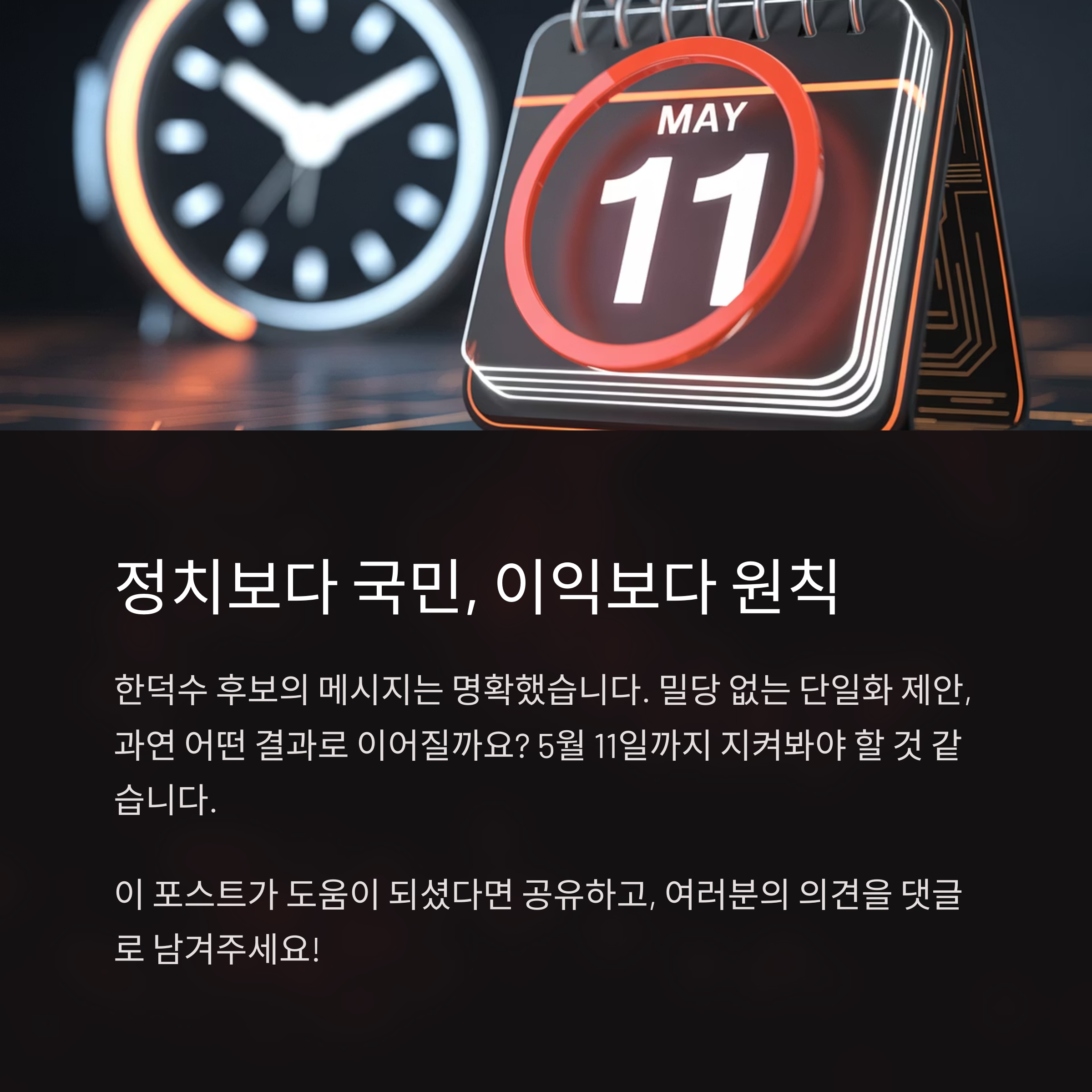 한 후보 캠프 이정현 대변인은 기자들과의 자리에서 “데드라인은 후보 등록 마감일인 5월 11일”이라며, “그때까지 반드시 단일화가 이뤄져야 한다”고 못박았습니다. 단일화 실패 시 후보 등록 포기 방침도 재확인했죠.