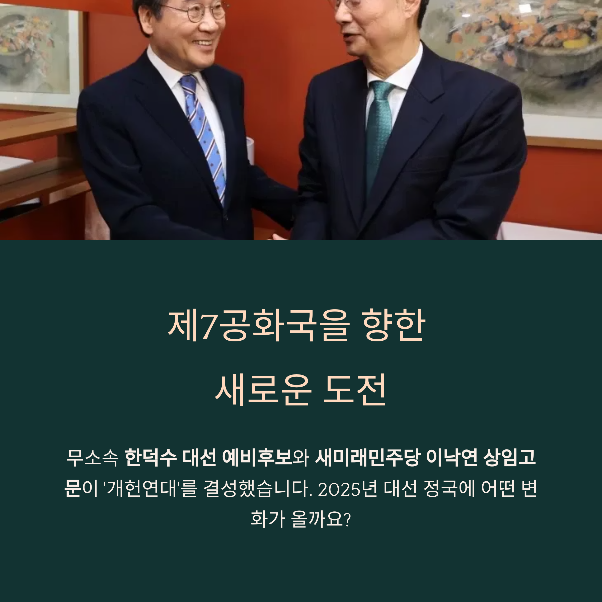 정치권의 이합집산이 예고된 2025년 대선 정국에서 큰 파장이 일고 있습니다. 무소속 한덕수 대선 예비후보와 새미래민주당 이낙연 상임고문이 ‘개헌연대’를 결성하며 제7공화국 출범을 위한 협력을 공식화했기 때문입니다.