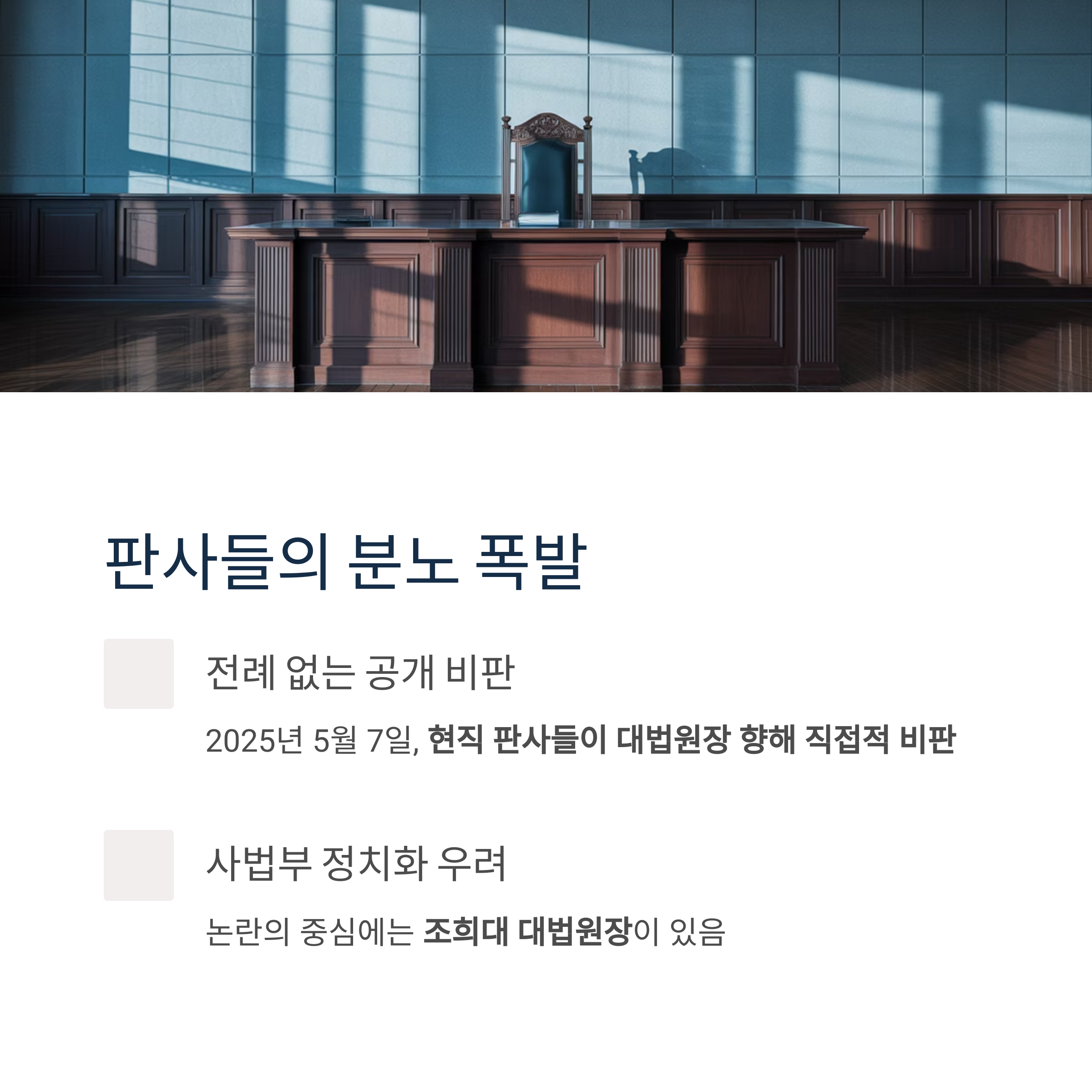 2025년 5월 7일, 사법부 역사상 보기 드문 상황이 벌어졌습니다. 현직 판사들이 대법원장을 향해 직접적이고 공개적인 비판을 쏟아내며 “사퇴하라”는 목소리를 내기 시작한 겁니다. 논란의 중심에는 조희대 대법원장이 있습니다.