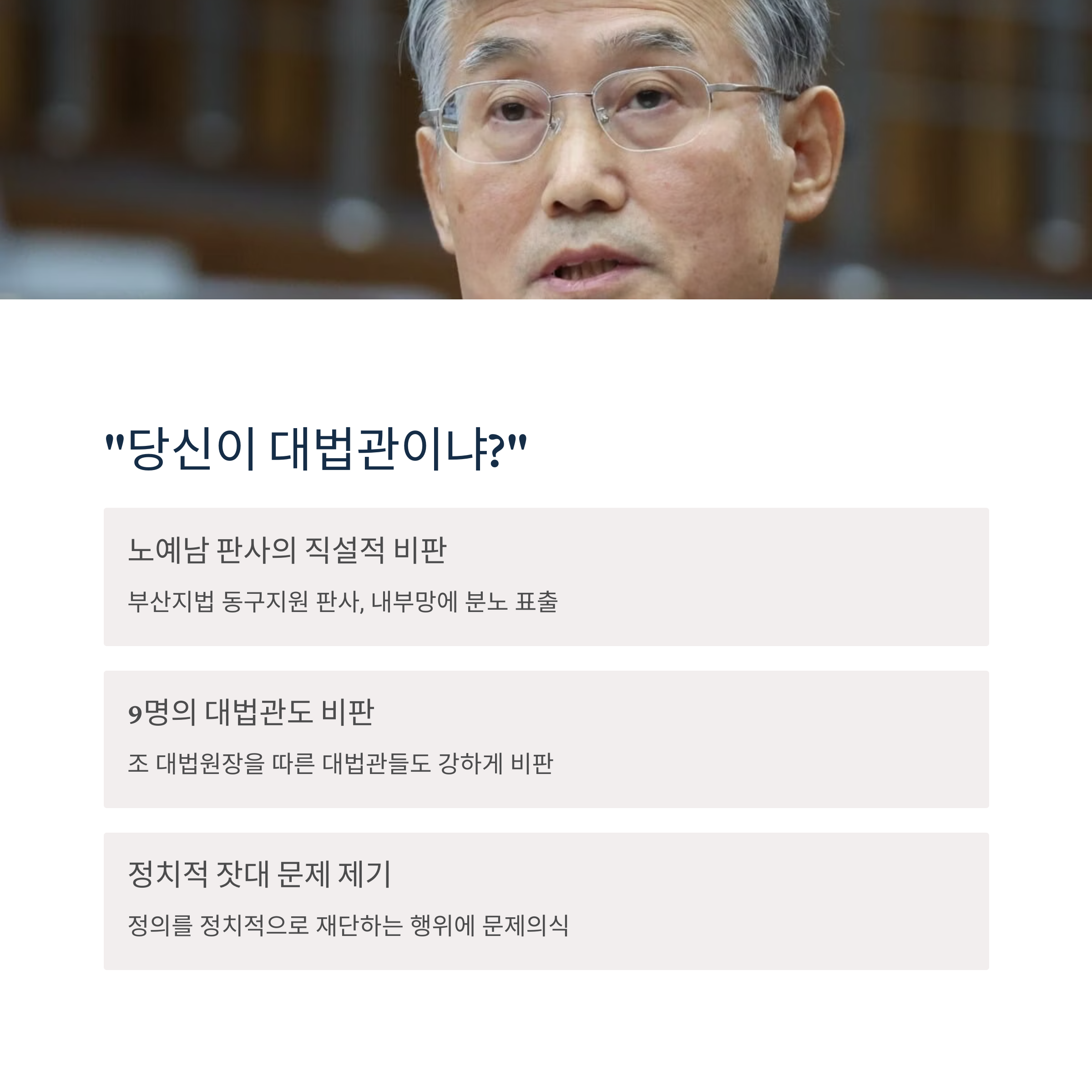 부산지법 동구지원의 노예남 판사 역시 내부망에 “당신이 대법관이냐?”는 직설적 표현으로 분노를 드러냈습니다. 그는 조 대법원장뿐 아니라 그를 따랐다는 9명의 대법관들도 강하게 비판했습니다.