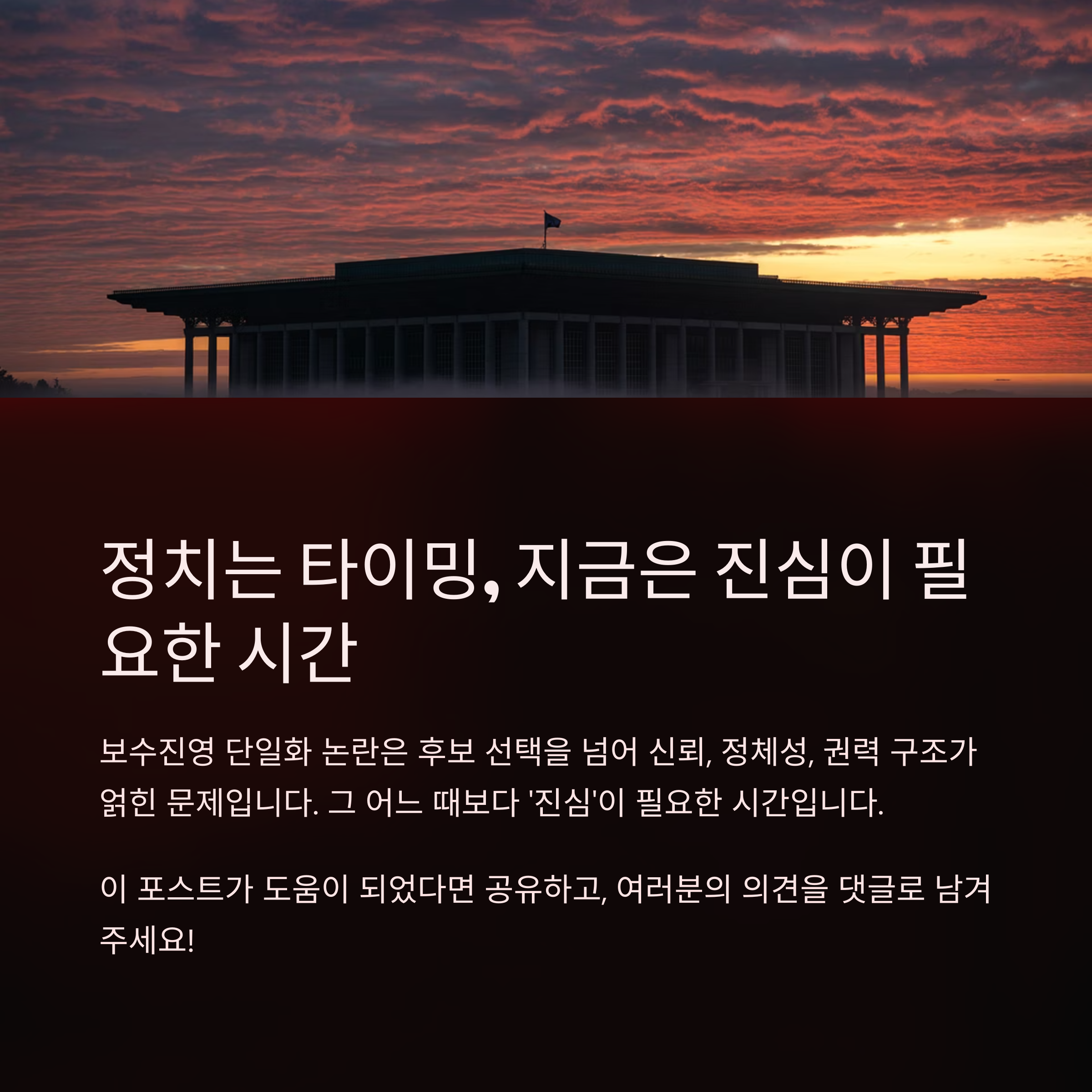 보수진영의 단일화 논란은 단순한 후보 선택의 문제가 아닙니다. 그 속에는 수십 년간 쌓아온 신뢰, 정체성, 그리고 세력 간의 권력 구조까지 뒤엉켜 있습니다. 정치는 타이밍이지만, 지금은 그 어떤 순간보다 ‘진심’이 필요한 시간입니다.