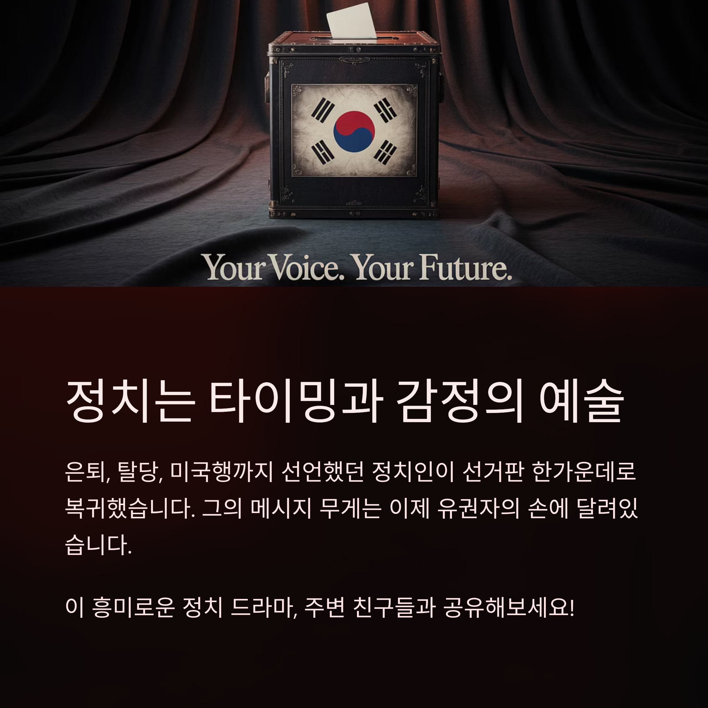 정치는 타이밍의 예술이자 감정의 싸움입니다. 은퇴와 탈당, 미국행까지 선언했던 정치인이 다시 선거판 한가운데로 복귀했습니다. 그가 던진 메시지의 무게는 이제 유권자의 손에 달려 있습니다.
