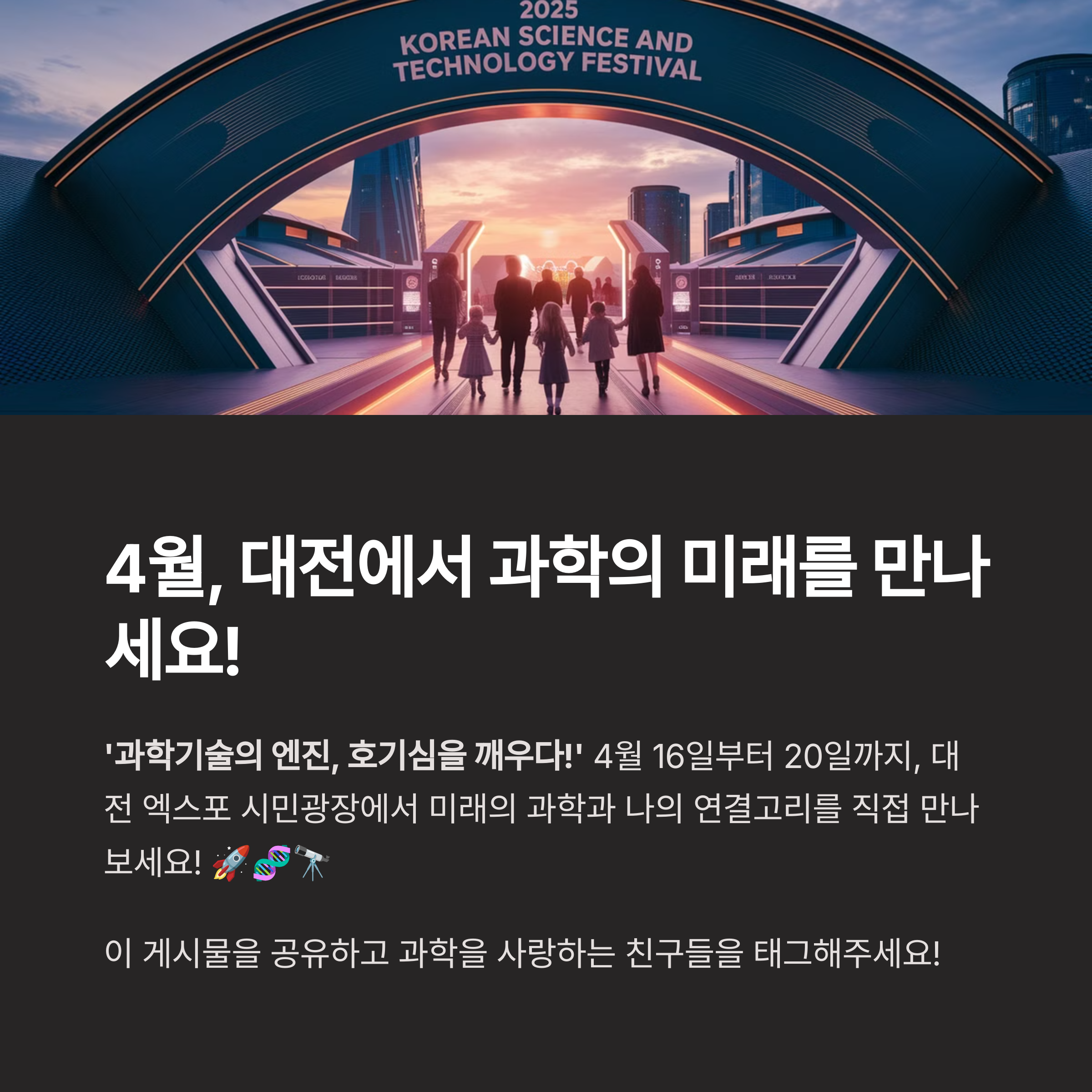 ‘과학기술의 엔진, 호기심을 깨우다!’ 4월 16일부터 20일까지, 대전 엑스포 시민광장에서 미래의 과학과 나의 연결고리를 직접 만나보세요! 🚀🧬🔭