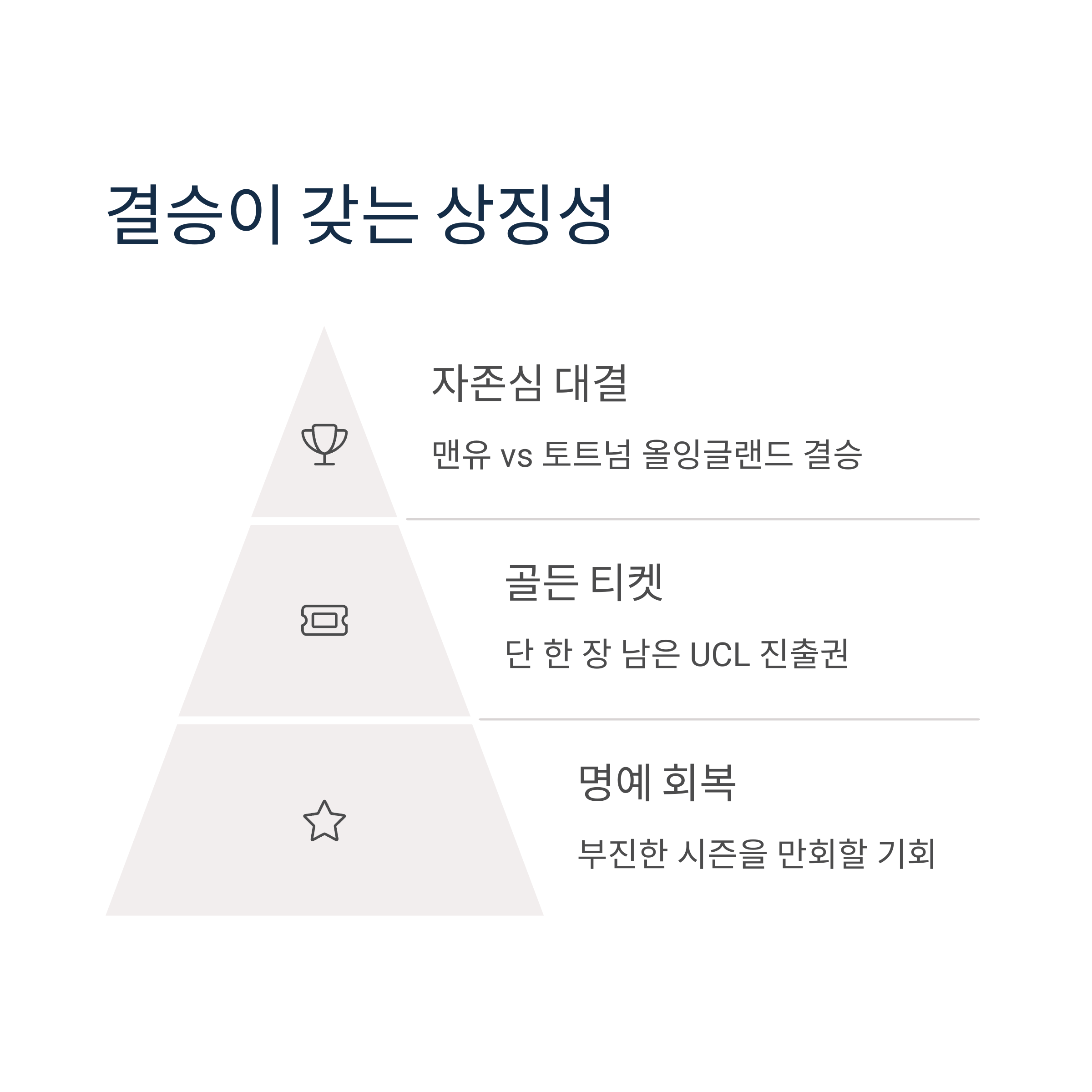 이번 결승은 단순한 우승 그 이상입니다. 챔피언스리그 진출이라는 보상이 걸려 있기 때문이죠. 프리미어리그 상위권 진입이 사실상 불가능한 두 팀에게, 유로파리그 우승은 단 한 장 남은 골든 티켓입니다. 게다가 맨유 vs 토트넘이라는 ‘올잉글랜드 결승’이 성사될 경우, 두 팀의 자존심 대결도 볼만할 겁니다.