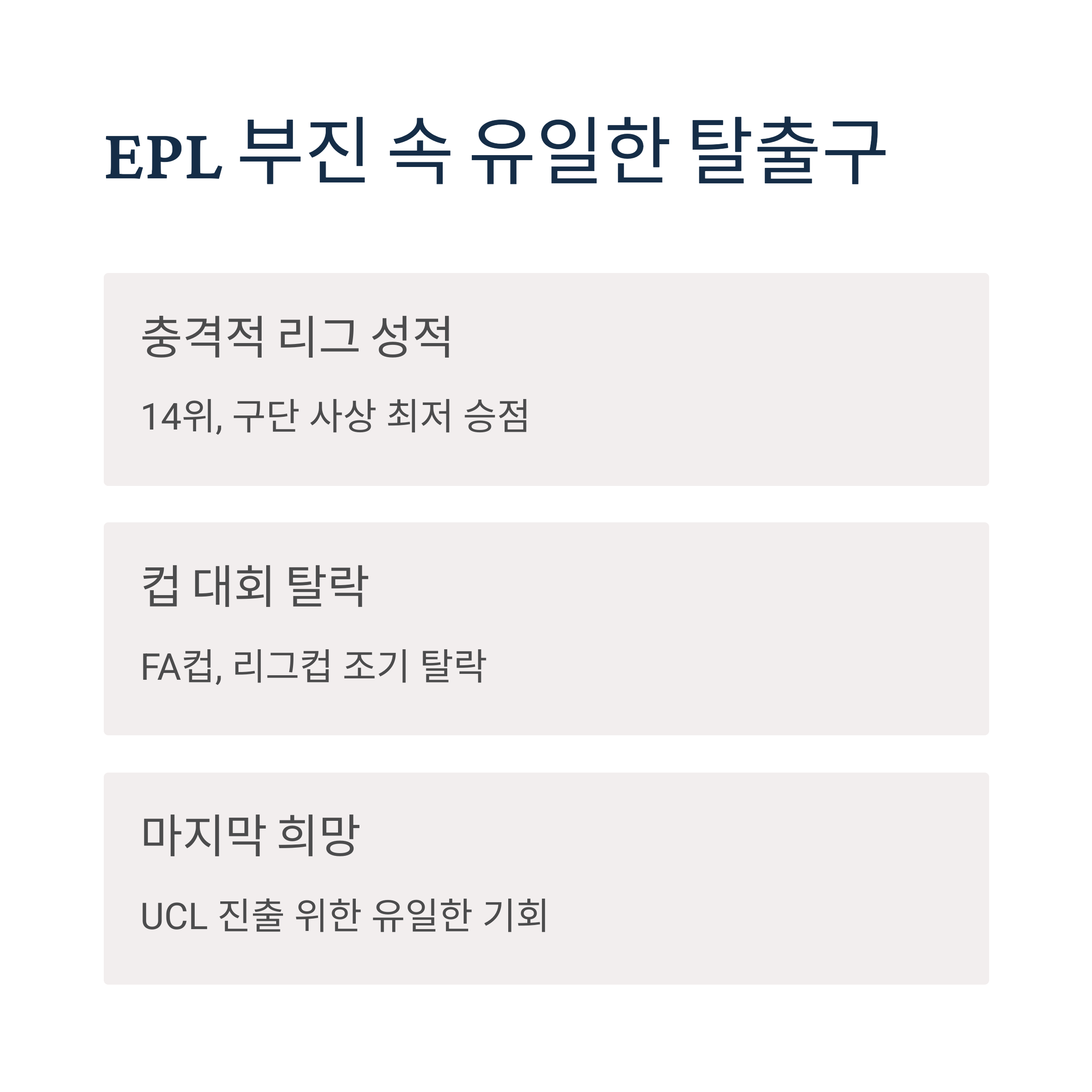 이번 시즌 맨유의 EPL 성적은 그야말로 충격적입니다. 14위라는 낮은 순위와 구단 사상 최저 승점이라는 불명예. FA컵과 리그컵에서도 일찌감치 탈락하며, 사실상 우승 가능성이 사라졌죠. 이런 상황에서 유로파리그는 다음 시즌 챔피언스리그(UCL) 진출을 위한 마지막 희망입니다.