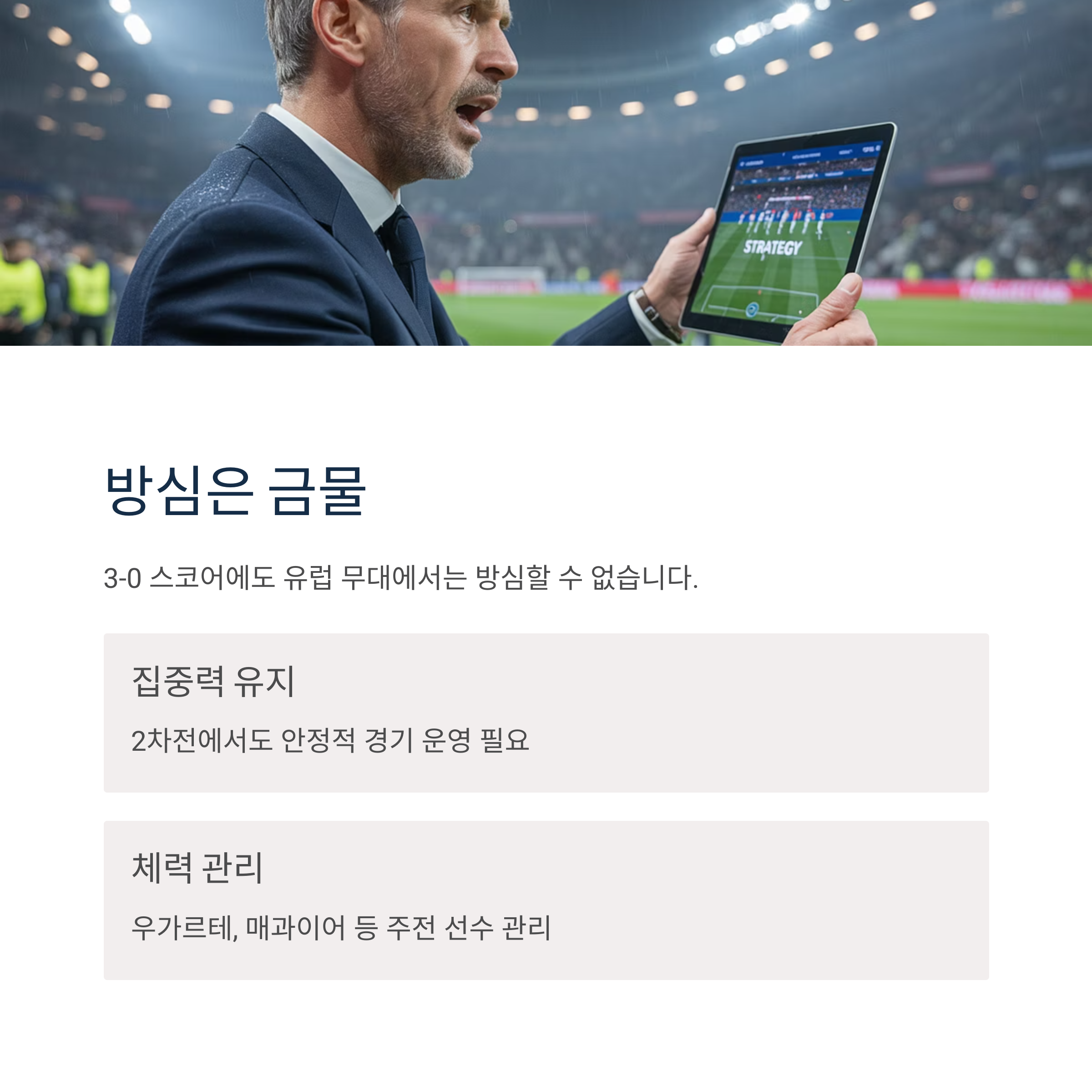 물론 3-0이라는 스코어는 매우 유리한 점수지만, 유럽 무대에서 방심은 금물입니다. 맨유는 2차전에서도 집중력을 잃지 말고, 안정적인 경기 운영을 통해 결승 진출을 확정지어야 합니다. 주전 선수들의 체력 관리도 중요하죠. 우가르테, 매과이어 등의 교체는 그 부분을 고려한 판단으로 보입니다.
