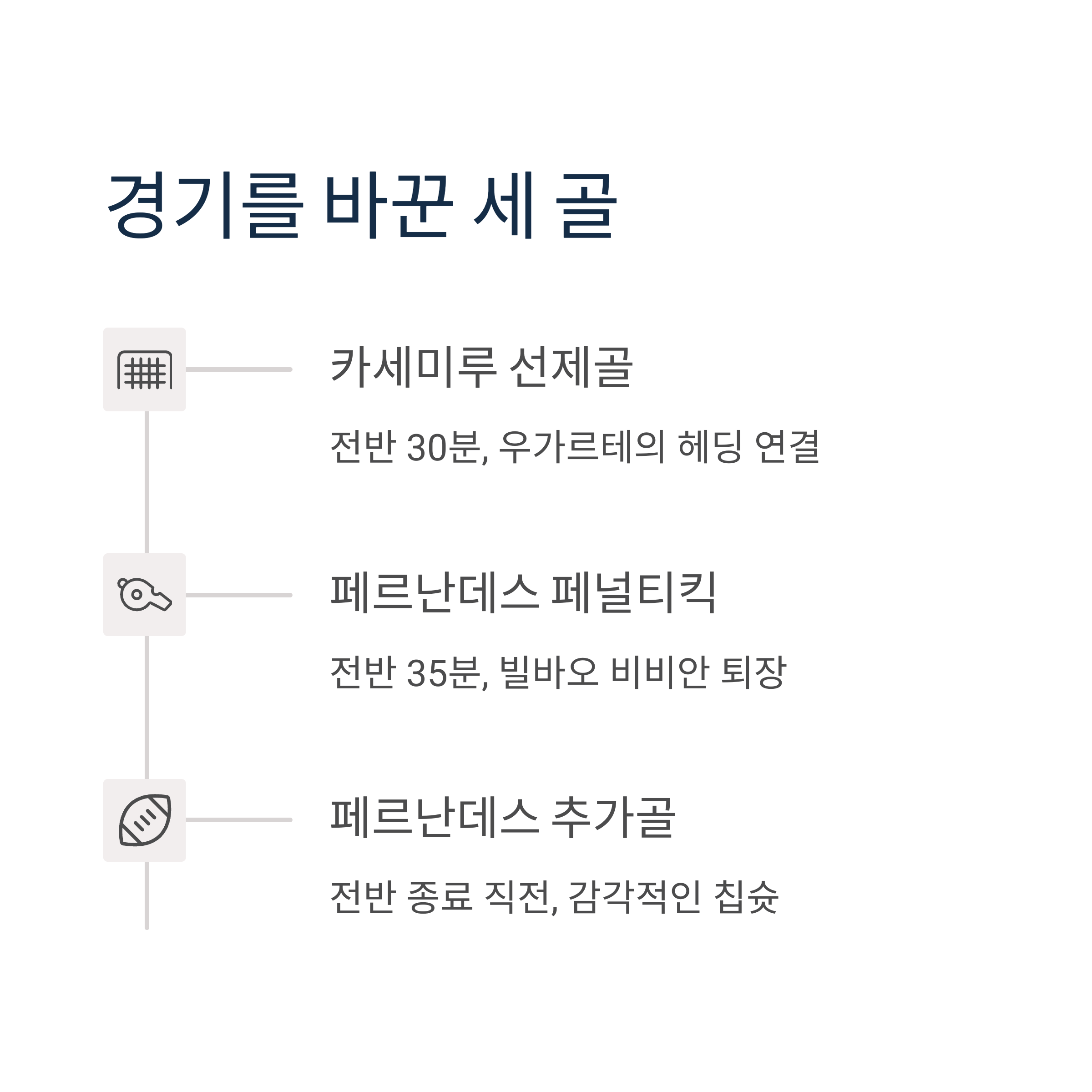 이 경기의 영웅은 단연 카세미루와 페르난데스였습니다. 수비형 미드필더인 카세미루는 강한 압박과 제공권 장악으로 빌바오의 공격을 차단했고, 선제골까지 넣으며 분위기를 가져왔습니다. 페르난데스는 그야말로 경기의 중심이었습니다. 페널티킥 성공, 감각적인 추가골, 중원 장악까지 모든 면에서 눈부셨습니다.