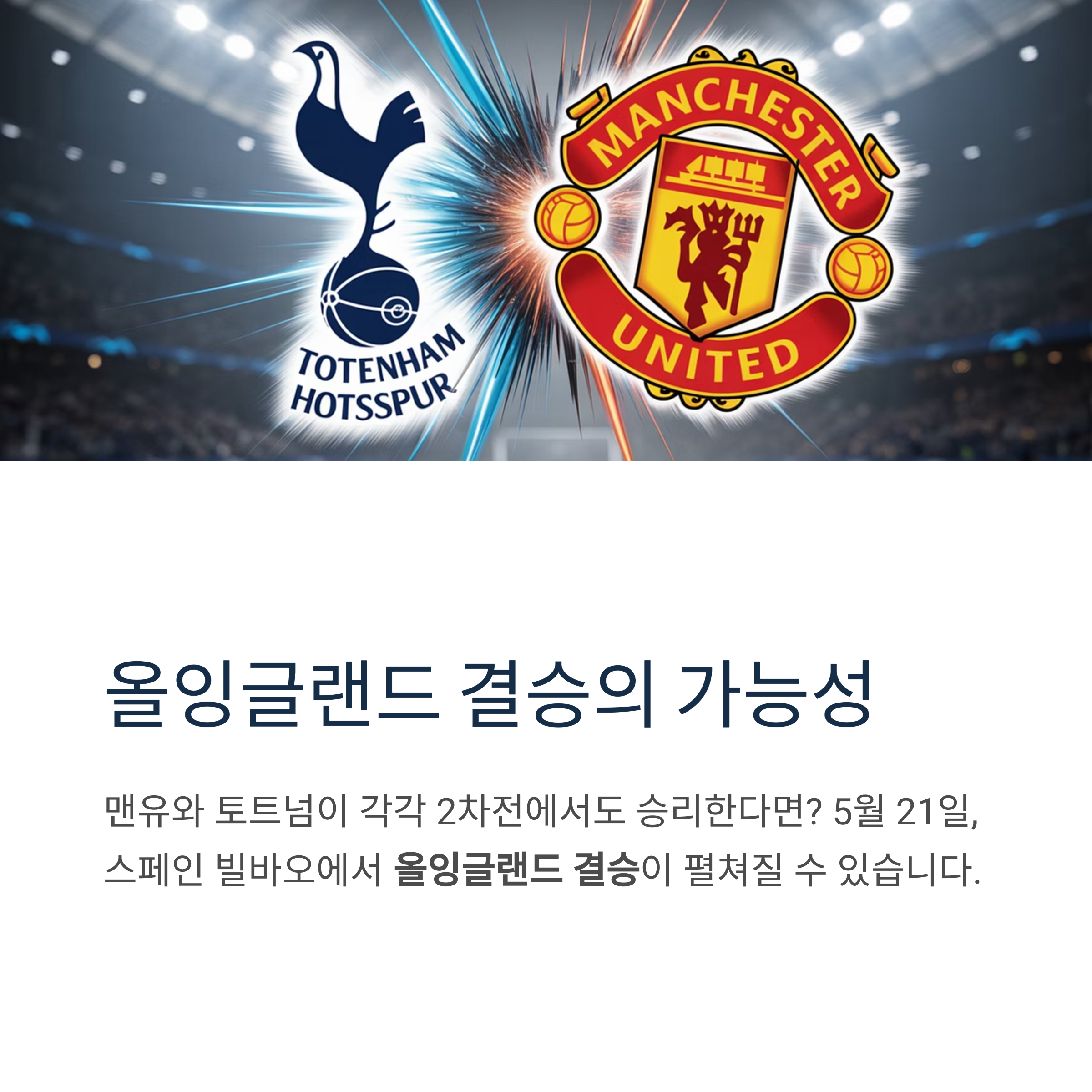 만약 맨유와 토트넘이 각각 2차전에서도 승리를 거둔다면요? 오는 5월 21일, 스페인 빌바오에서 '올잉글랜드 결승'이라는 드라마틱한 무대가 현실이 될 수도 있습니다. 지금까지의 모든 부진을 씻고, 자존심을 건 한 판 승부가 성사된다면 그야말로 유로파리그 역사의 한 페이지가 될 겁니다.😤🔥