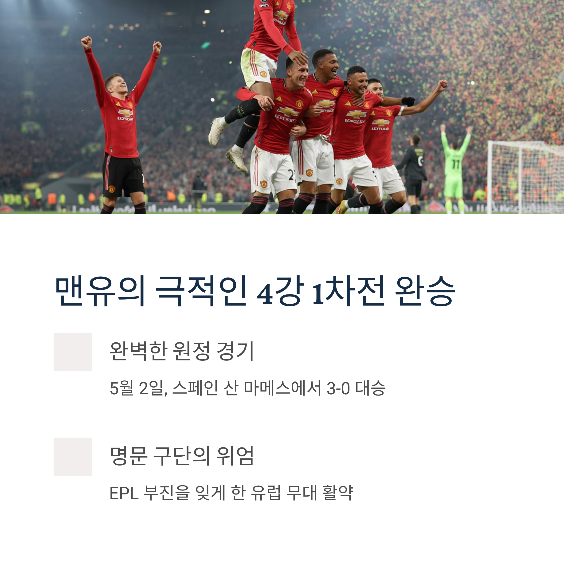 정말 믿기지 않을 만큼 완벽한 경기였습니다. 5월 2일(한국시간), 스페인 산 마메스에서 펼쳐진 4강 1차전에서 맨유는 아틀레틱 빌바오를 상대로 3-0 대승을 거뒀습니다. 그것도 원정 경기에서 말이죠! EPL에서 부진했던 모습은 온데간데없고, 유럽 무대에서는 살아있는 명문 구단의 위엄을 보여줬습니다.