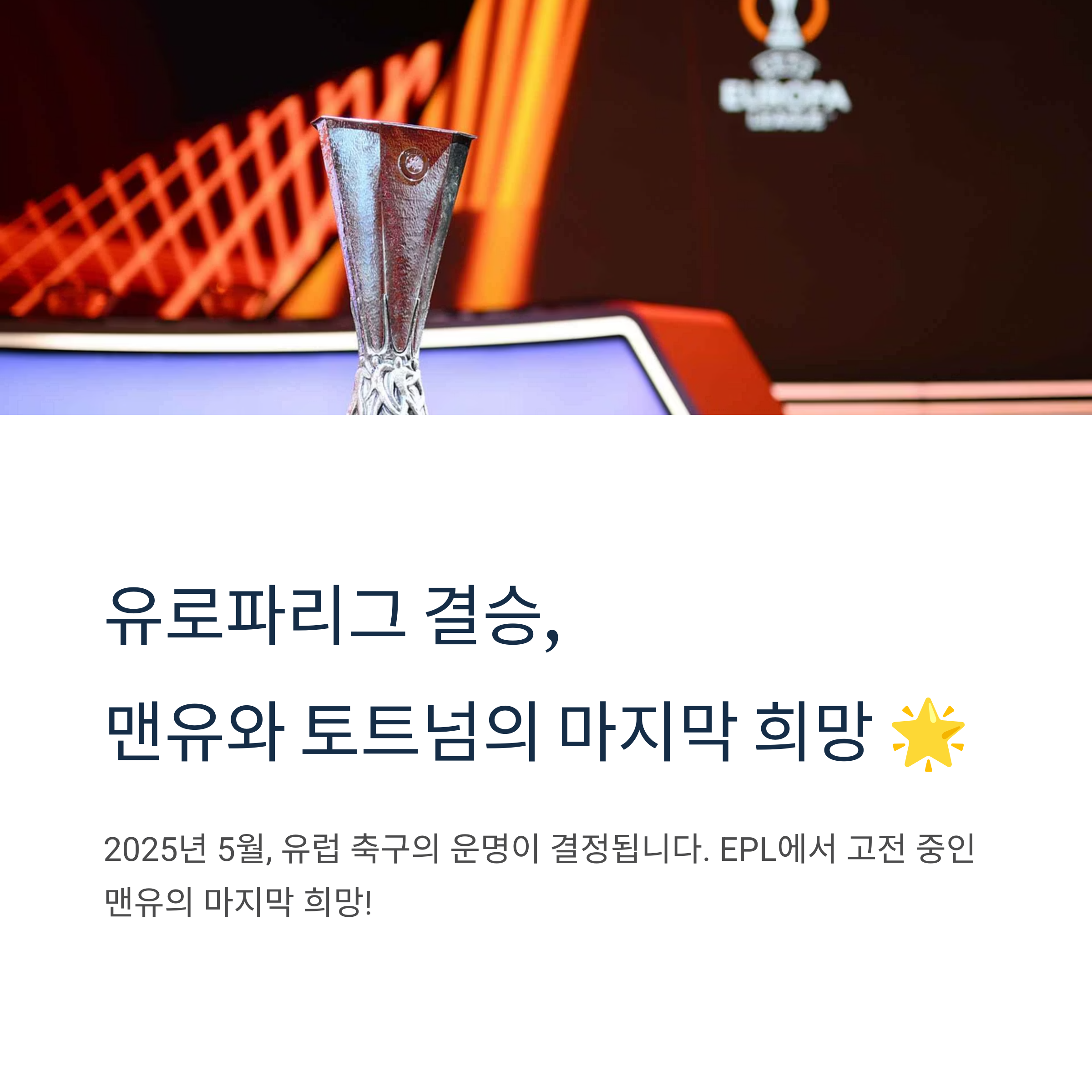 📅 2025년 5월. 유럽 축구 팬이라면 절대 놓칠 수 없는 순간이 다가오고 있습니다. 바로 UEFA 유로파리그(UEL) 결승전입니다. 올 시즌 프리미어리그(EPL)에서 고전하고 있는 맨체스터 유나이티드(이하 맨유)가 마지막 희망을 유로파리그에 걸고 결승 진출을 눈앞에 두고 있죠. 저도 이 경기를 실시간으로 지켜보면서 손에 땀을 쥐었습니다!