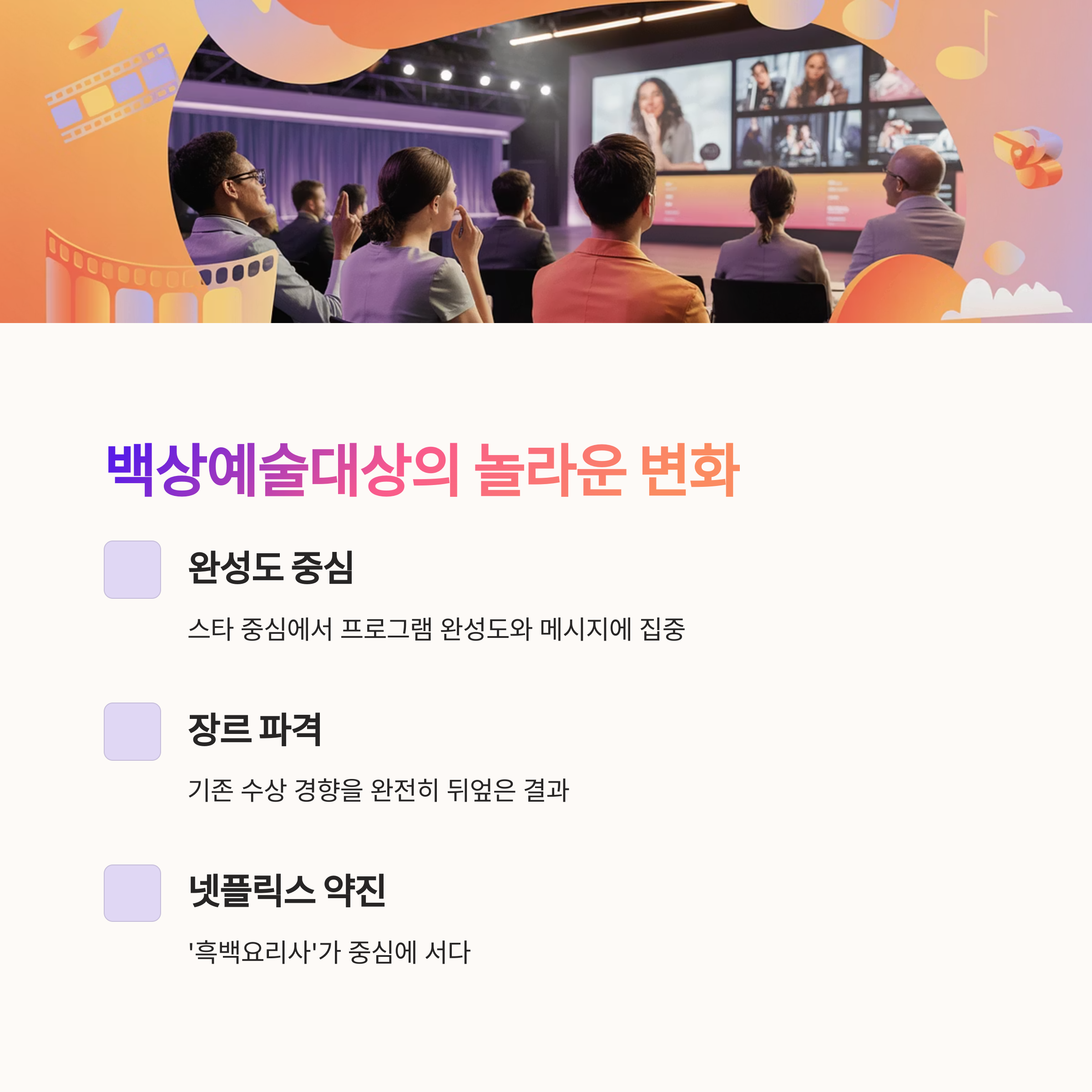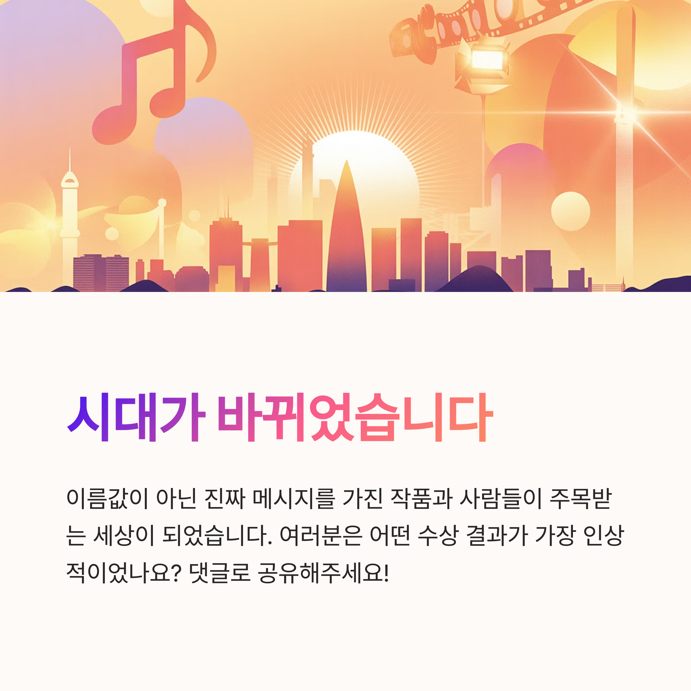 저는 이번 시상식을 보며 ‘이제 진짜 시대가 바뀌었구나’를 느꼈어요. 단순히 이름값만으로 수상하는 시대는 끝났고, 진짜 메시지를 가진 작품과 사람들이 주목받는 세상이 된 거죠. 다음 시상식도 벌써 기대되네요!