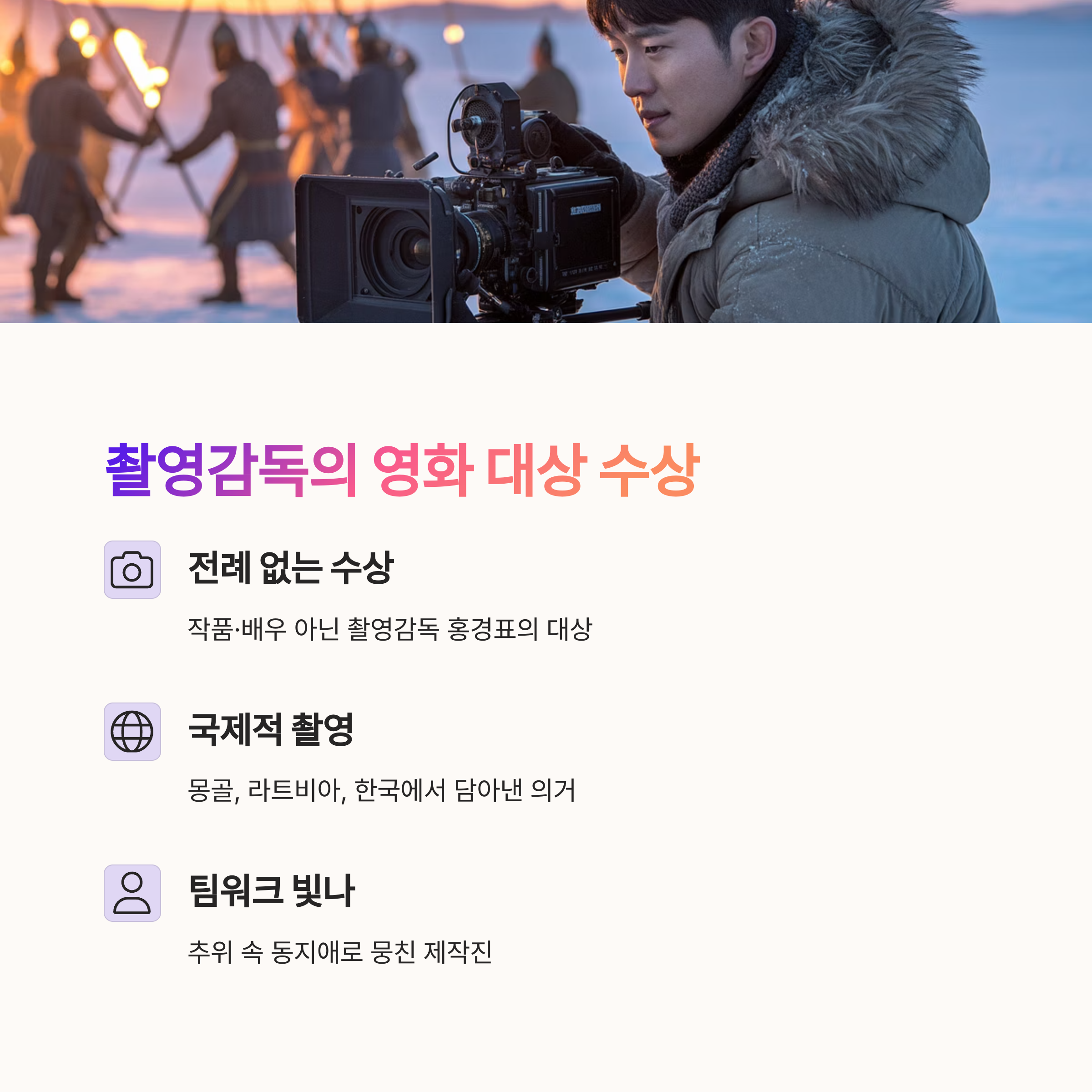 영화 ‘하얼빈’의 홍경표 촬영감독이 영화 대상을 수상하며 또 한 번의 파격이 이어졌습니다. 작품도, 배우도 아닌 ‘촬영감독’의 수상이라니… 전례가 없는 일이었어요. 안중근 의사의 의거를 몽골, 라트비아, 한국에서 담아낸 장면들 하나하나에 그 의미가 새겨졌습니다. 추위 속 동지애로 똘똘 뭉친 팀워크도 빛났죠.